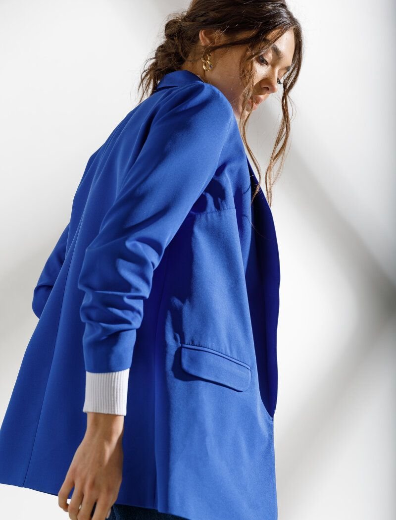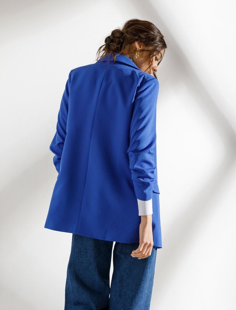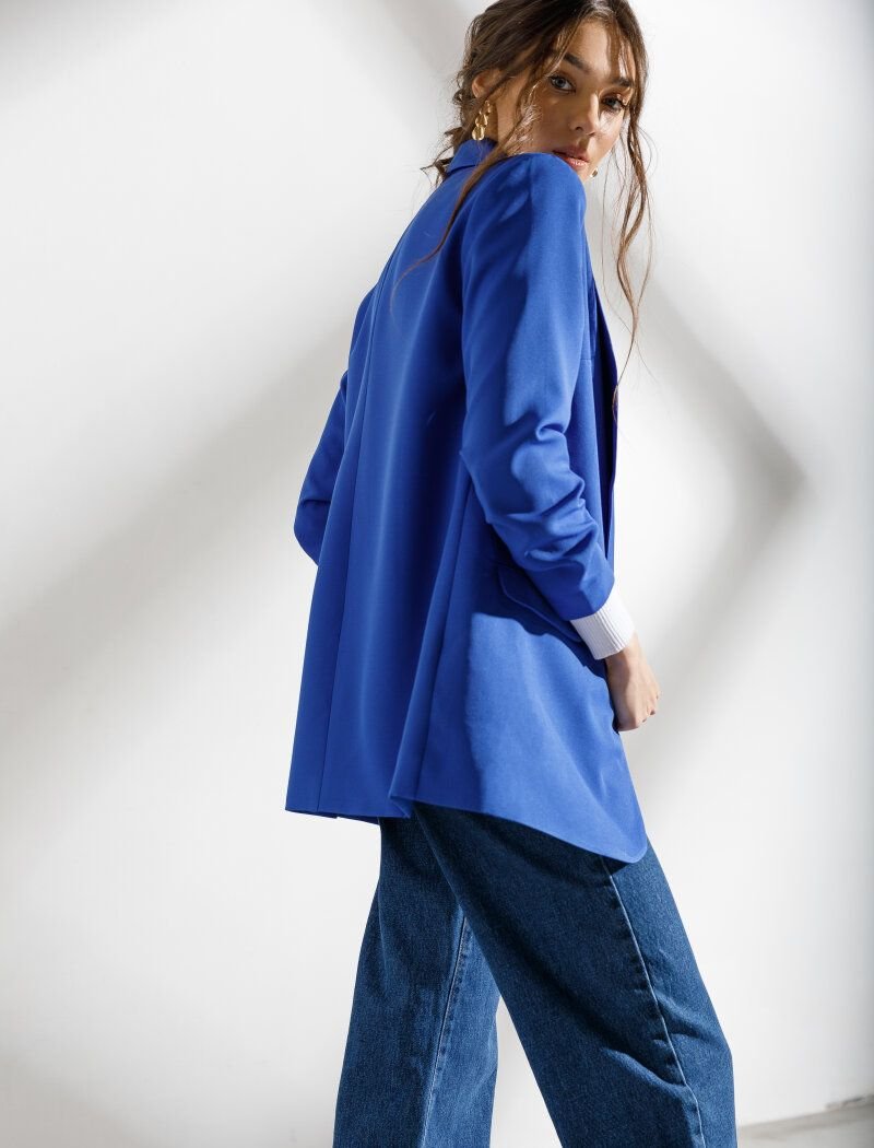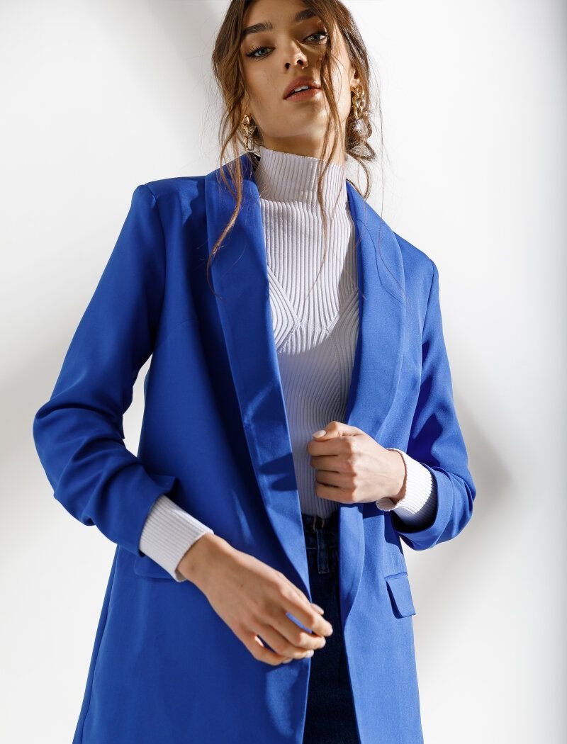 Thanks to the laconic design and bright blue color|the jacket will easily complement the bows in the color block style. The model of an elongated straight cut is complemented by a shawl collar|side pockets with flaps and sleeves ? with drapery. The absence of a clasp allows you to feel as free as possible.