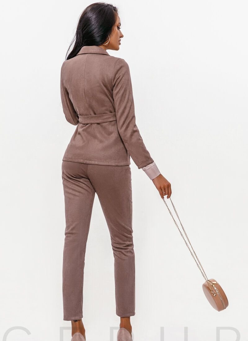 trendy suit made of soft eco-suede in a chocolate shade: a jacket with a turn-down collar, lapels, long sleeves, contrasting massive buttons and patch pockets with a flap, complemented by a removable plain belt, medium-fit trousers with zips and two welt pockets. ..