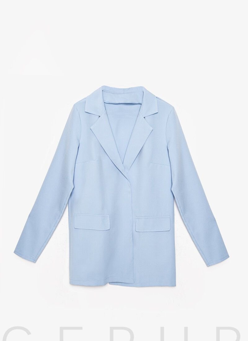 Casual solid blue suit. A loose-fitting blazer with a turn-down collar, lapels, a long sleeve and fake pockets in the front. Trousers of a straight cut, medium fit, with two welt pockets on the sides, fixed arrows along the entire length and lapels.