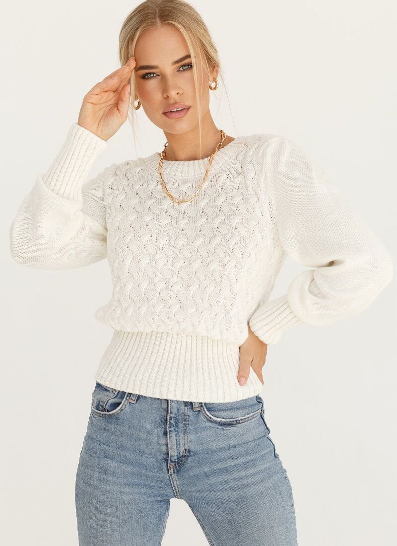 Fitted jumper of basic white color. The front side is decorated with openwork weaving. Thanks to the material, such a product will be comfortable both indoors and outdoors. The long sleeve and the bottom edge are complemented by wide elastic straps. The model will take on the whole load in an image with laconic jeans and sneakers.
