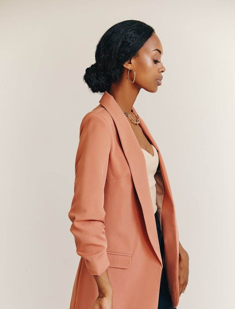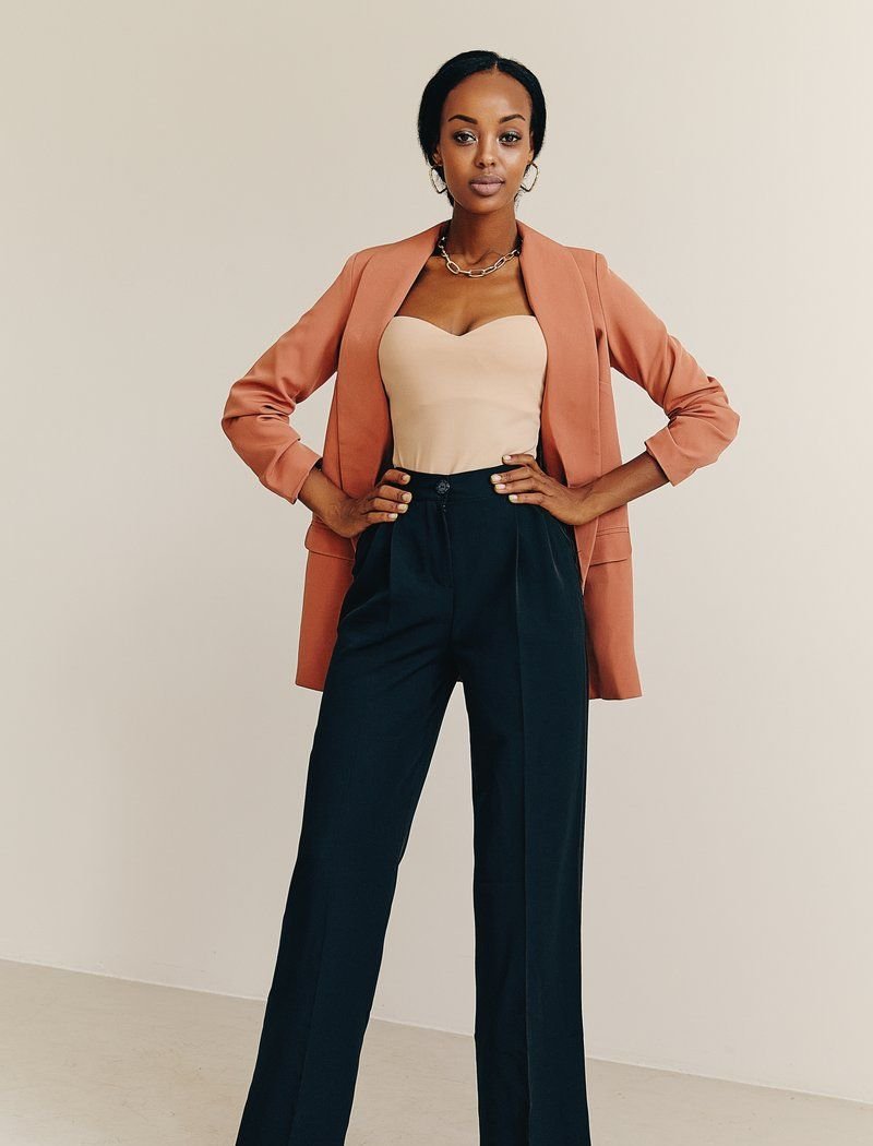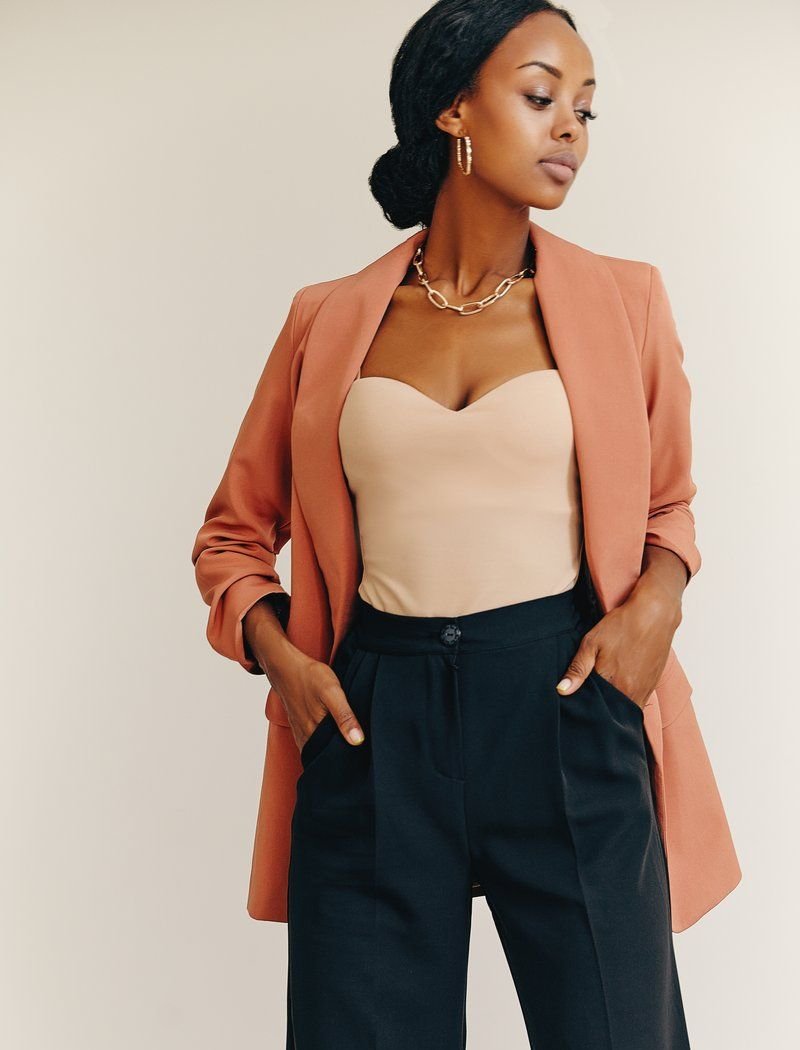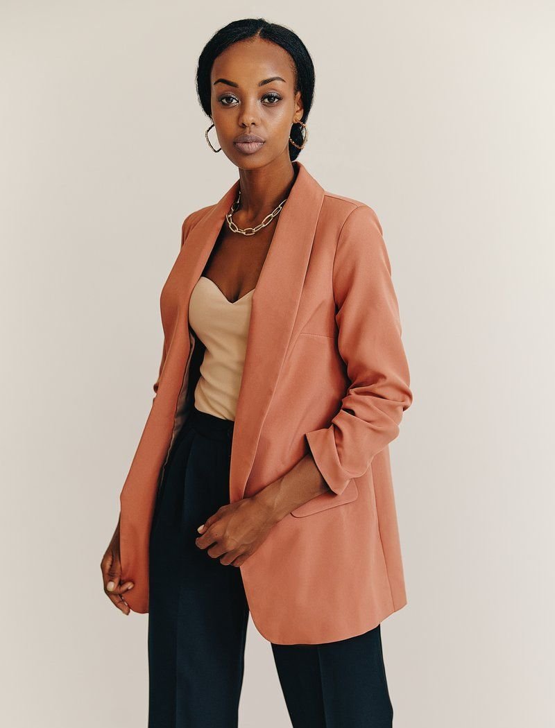 Powdery jacket with a turn-down collar|does not fasten. Inserts are provided in the shoulders|which helps to keep the shape|a shortened sleeve with an assembly|with pockets. It can be combined with both trousers and jeans.