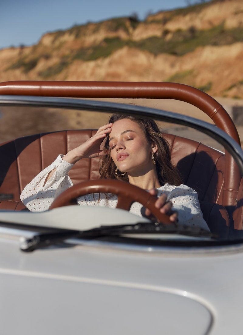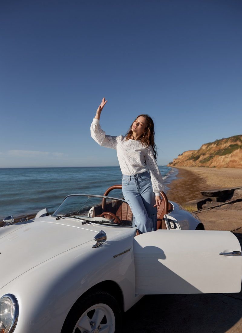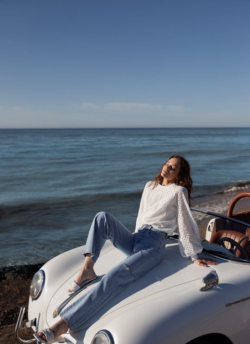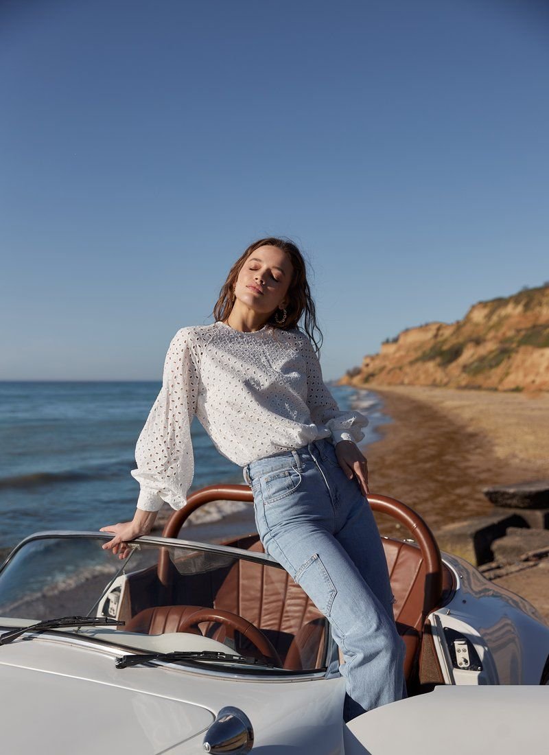 A white blouse made of light stitching can become the basis of a romantic image in the boho style. The model is complemented by an up–to-date SS'21 detail - voluminous sleeves. A loose fit and a pleasant lining to the body will make you feel as comfortable as possible.