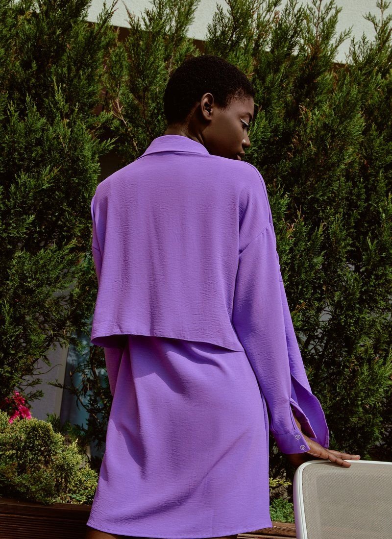 The purple color sets the tone for a set of a slip dress and a loose shirt. The model was made of light material with a pleasant texture. The shirt was supplemented with a tie-knot in the front, and the dress with narrow non-adjustable straps.