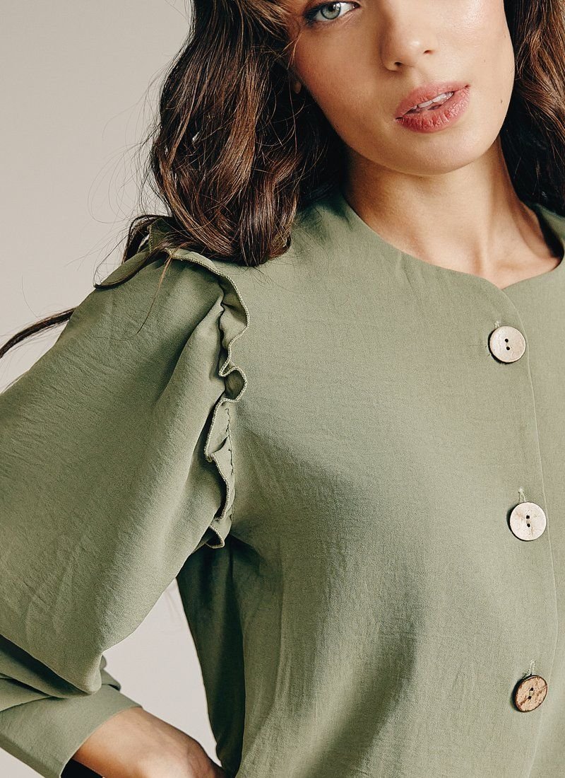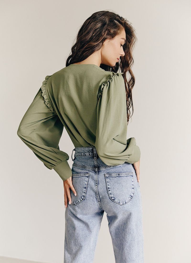 Blouse of a straight cut with a round neck on buttons stylized as wood. The long sleeve at the base is decorated with a thin neat frill, with wide cuffs. This blouse will go perfectly with both trousers and jeans.