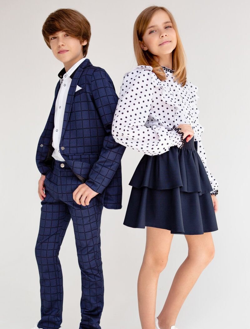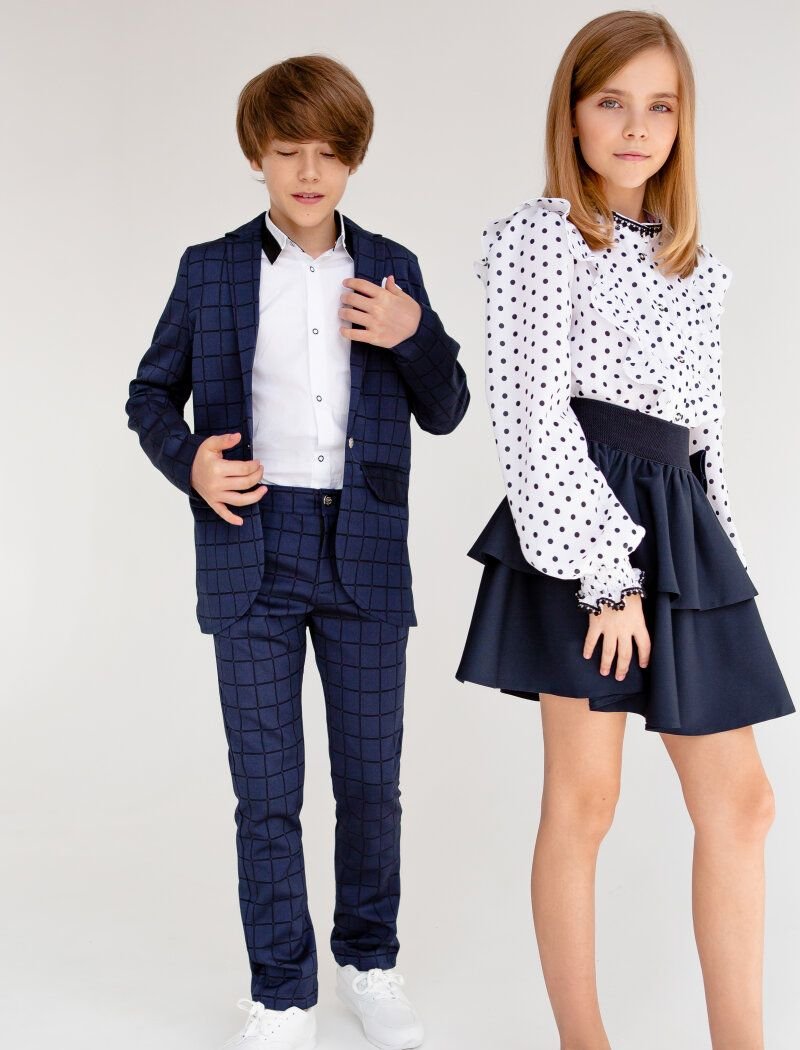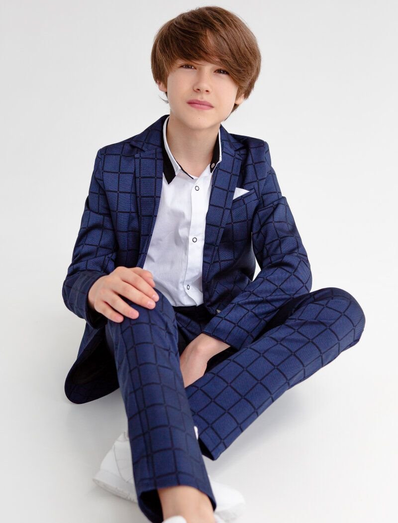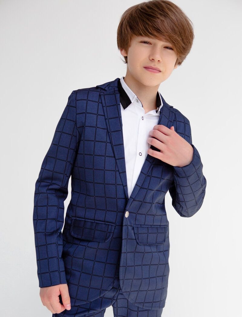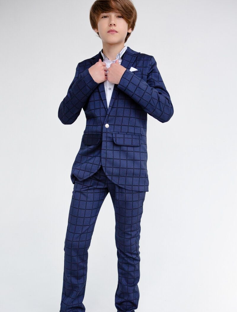 A blue two-piece suit in a large cage for school days and festive events. Single-breasted jacket with a turn-down collar and lapels, a decorative welt pocket with a handkerchief on the chest, two welt pockets with flaps on the hips. Straight-cut trousers with a high waist.