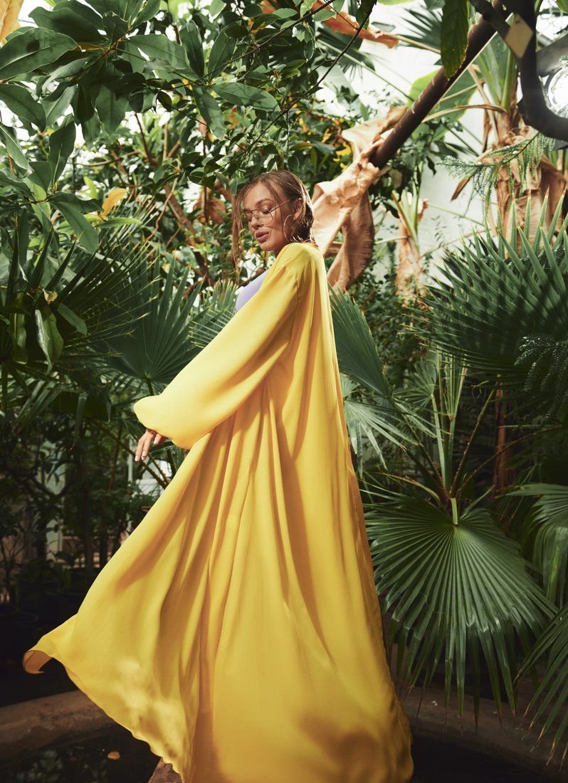 A loose tunic will inevitably attract attention due to the bright yellow shade, which was included in the list of relevant SS'21. The model was sewn from chiffon material. The comfort of the landing can be adjusted with a belt-ribbon.