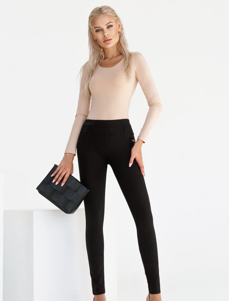 Tight-fitting leggings can also be included in an everyday image, and even dilute a delicate romantic bow with them, if you choose an airy translucent blouse. The laconic cut with a pull-in belt provides comfort.