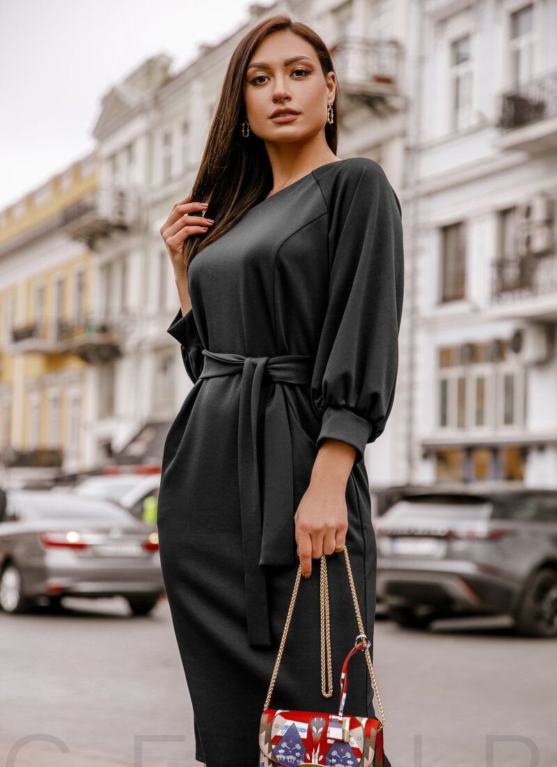 A fitted midi dress in black, made of elastic Italian knitwear: round neck, one-piece voluminous sleeves on a wide cuff, modeling recesses, two side pockets in the seams, a straight-cut skirt with a slit in the back, complemented by a removable plain belt.