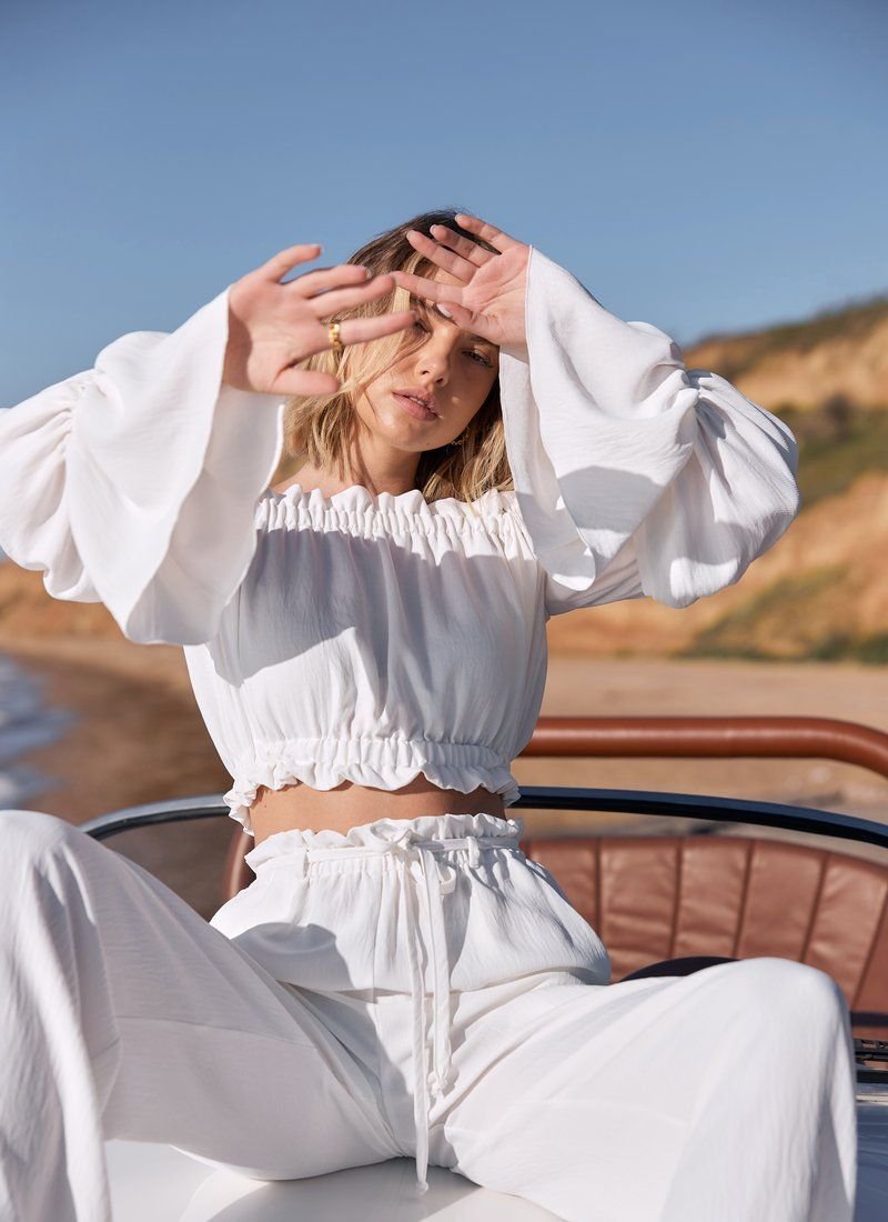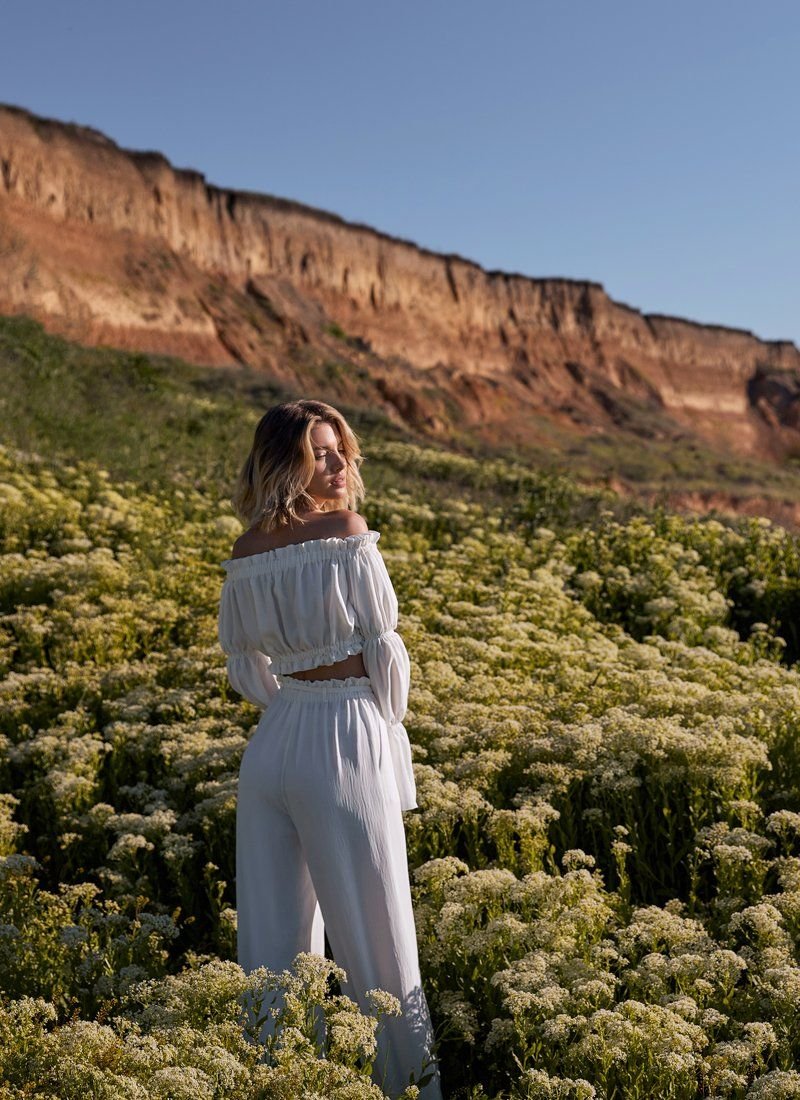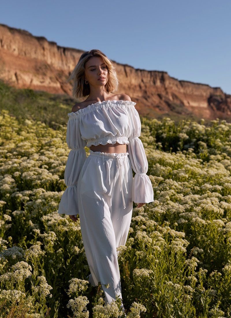 Romantic summer set from Gepur designers. To create this model, a soft fabric with a compressed texture was used. The trendy top of the cropped cut is distinguished by a deep boat neckline with elastic inserts, which allows you to open the shoulders. A spectacular long sleeve with a flounce and ruffle decor are some of the most relevant details of SS21. Flowing summer trousers of a loose cut, made of soft pressed fabric. The trendy high-rise trousers are marked by an elastic insert, ruffles and a removable belt in loops. Two small pockets on the sides give the model its practicality.