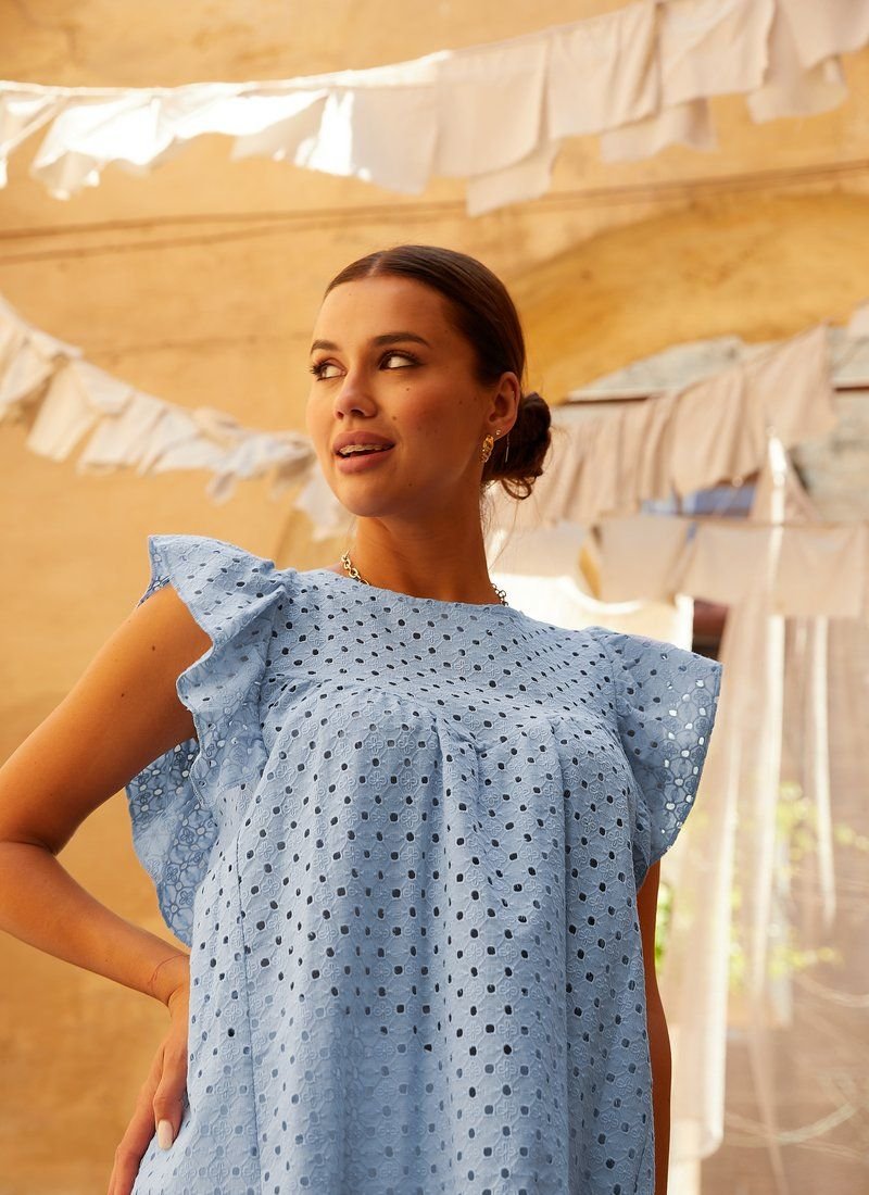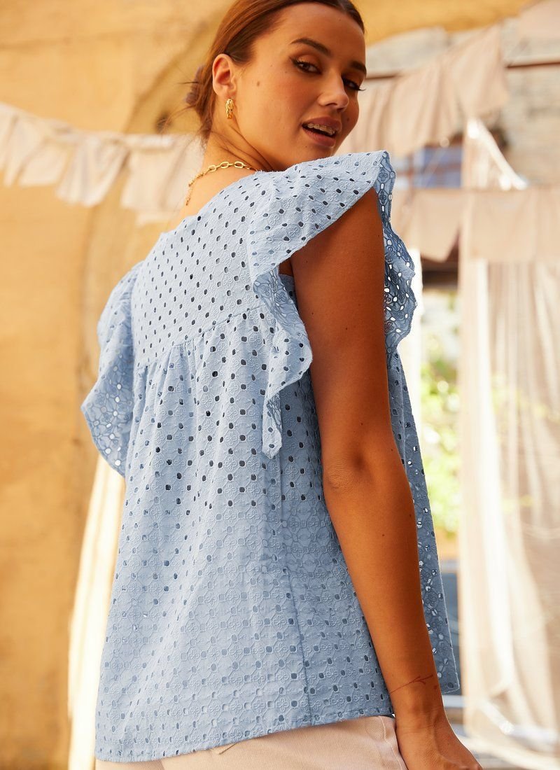 An actual summer blouse made of stitching with floral embroidery. The original flared cut of the blouse is complemented by a neat yoke and wide flounces imitating sleeves.