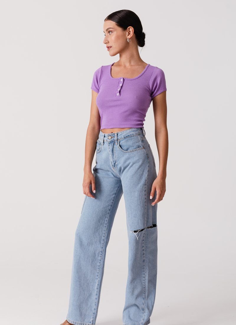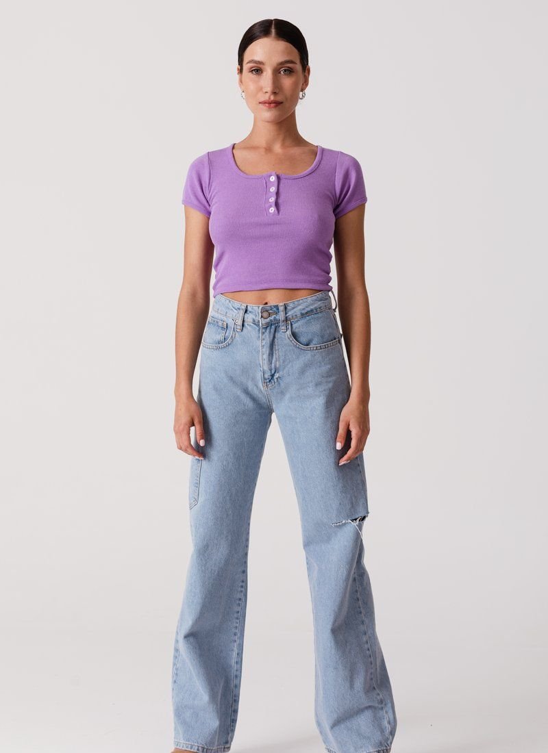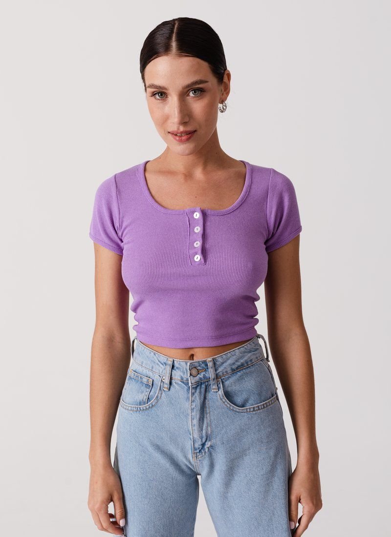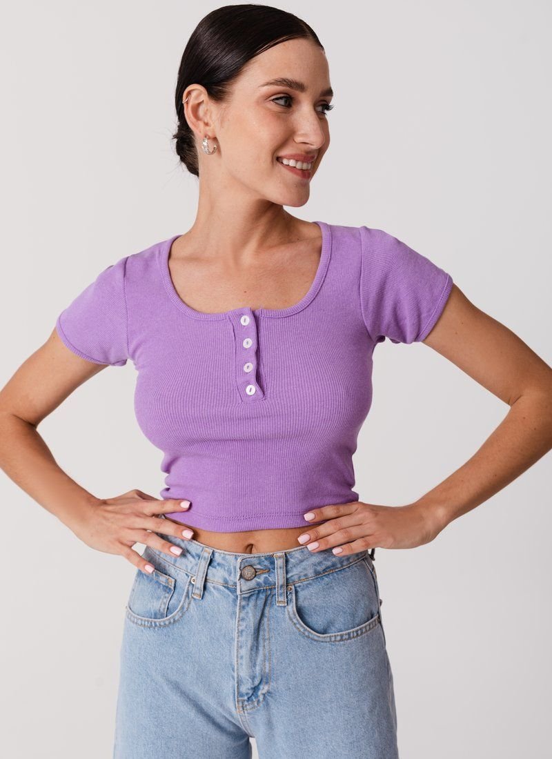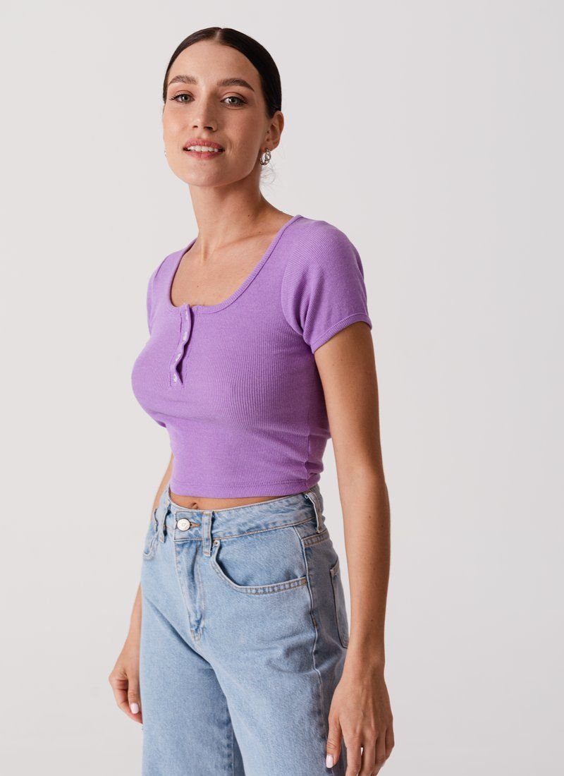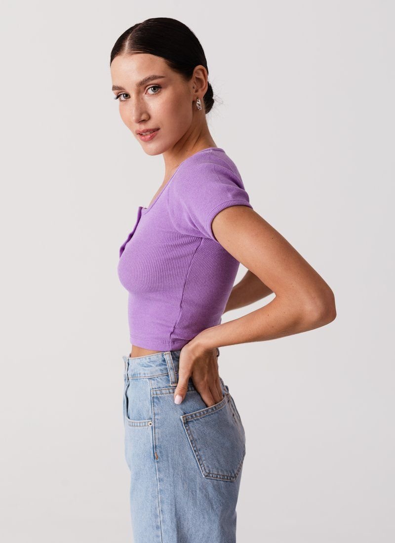 Knitted models can look no less impressive than outfits made of other fabrics. The lavender top is an eloquent proof of this. The model made of soft material stretches well, so it fits the body like a second skin.