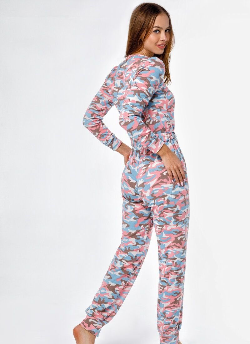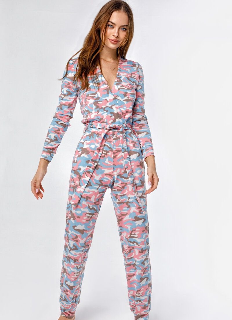 The jumpsuit with a bright print is made of knitwear with an admixture of angora wool, which allows you to feel as comfortable as possible. Makes the silhouette fitted belt-ribbon of the main material.