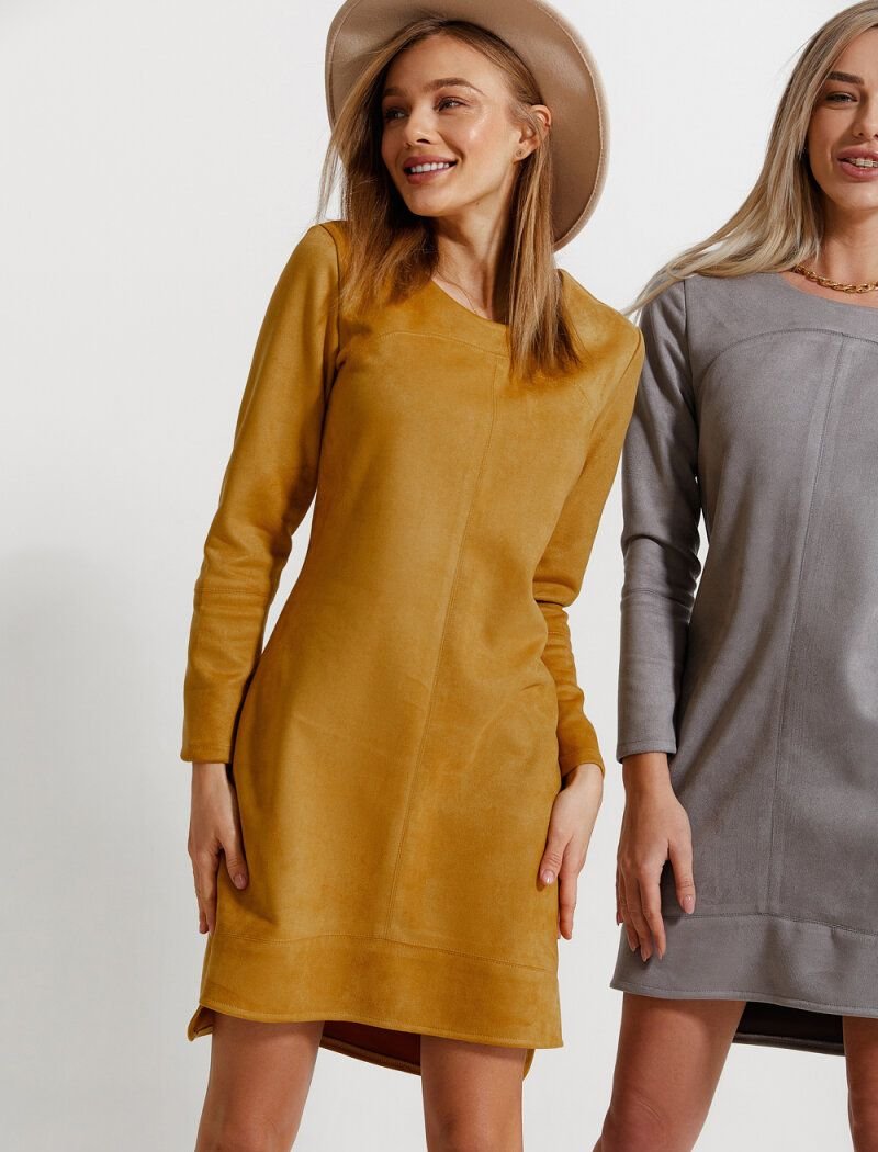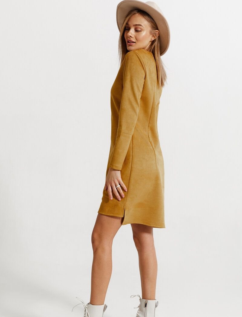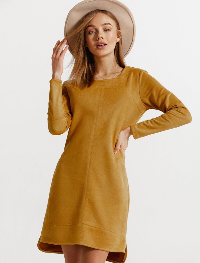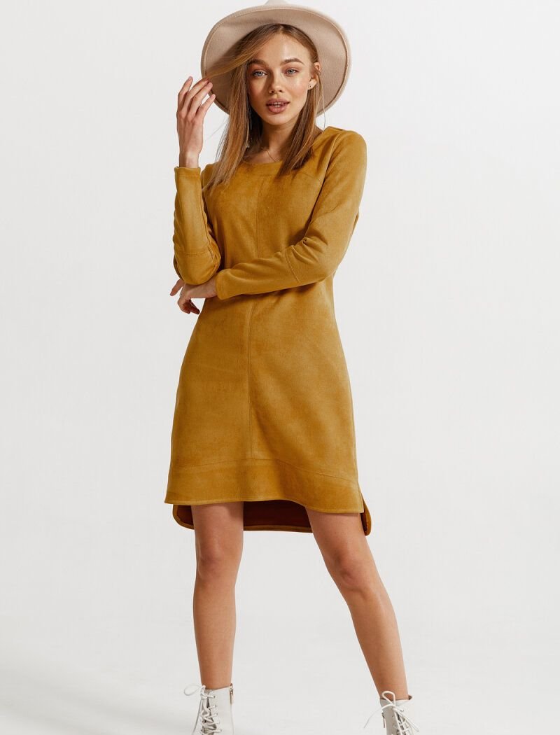 Suede mustard dress: round neck, long sleeve and elongated back.