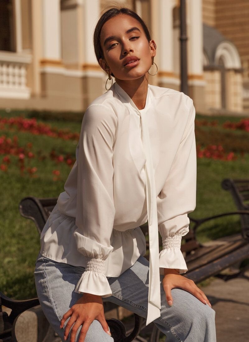 A loose-fitting blouse in casual style, made of flowing fabric. A small teardrop-shaped neckline on the chest, a short collar with ties, elastic inserts on the belt and sleeves. The blouse is complemented with stylish ruffles.