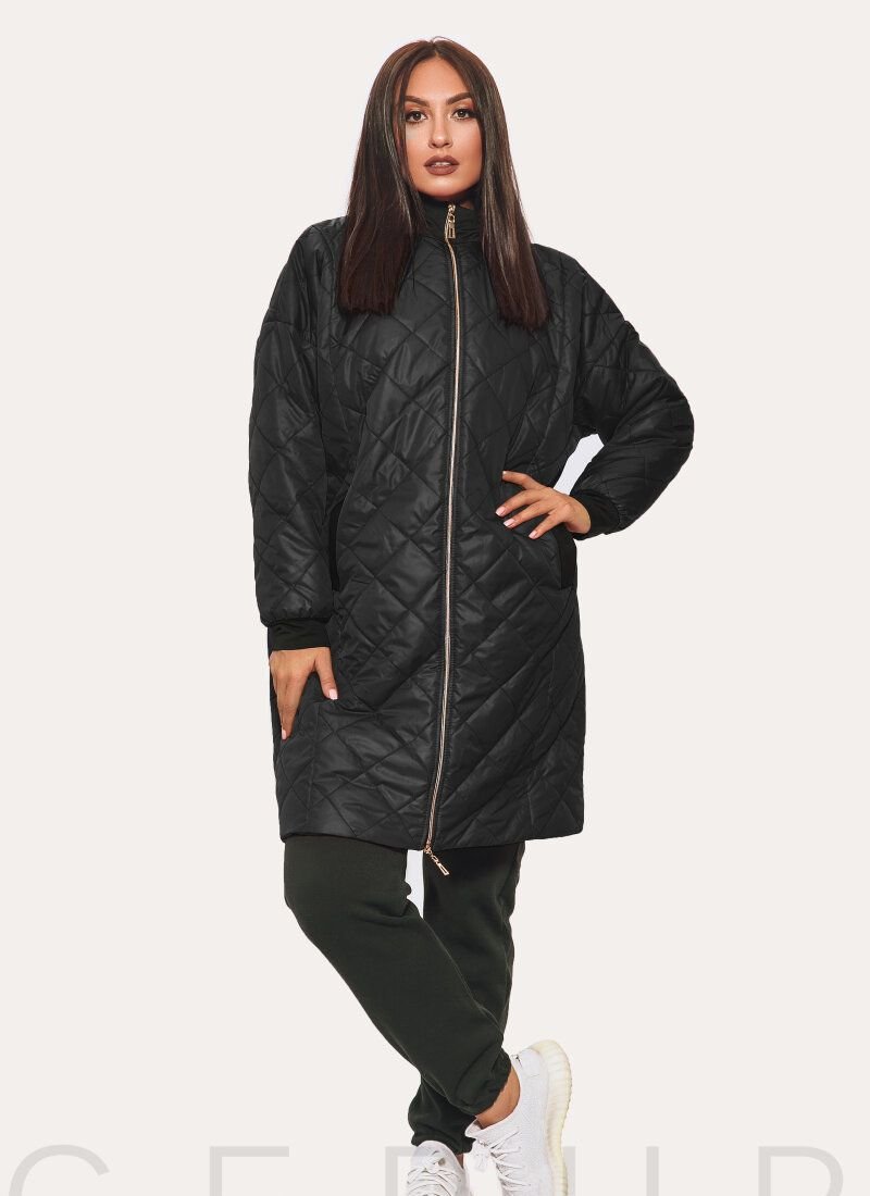 Elongated black jacket-oversize: non-detachable hood, stand-up collar, voluminous sleeve with contrasting elastic cuff, two welt pockets.Features: additional insulation - sintepon (100 g /m2). Please note that the product is designed for temperatures up to +5 °C.