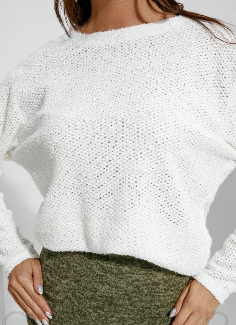 A trendy set made of soft warm fabric: a snow-white oversize sweater made of cozy yarn with a round neck, long sleeves, a straight-cut knitted skirt with an inflated waistline, a tie-in belt with an elastic insert and a low slit at the back. ..