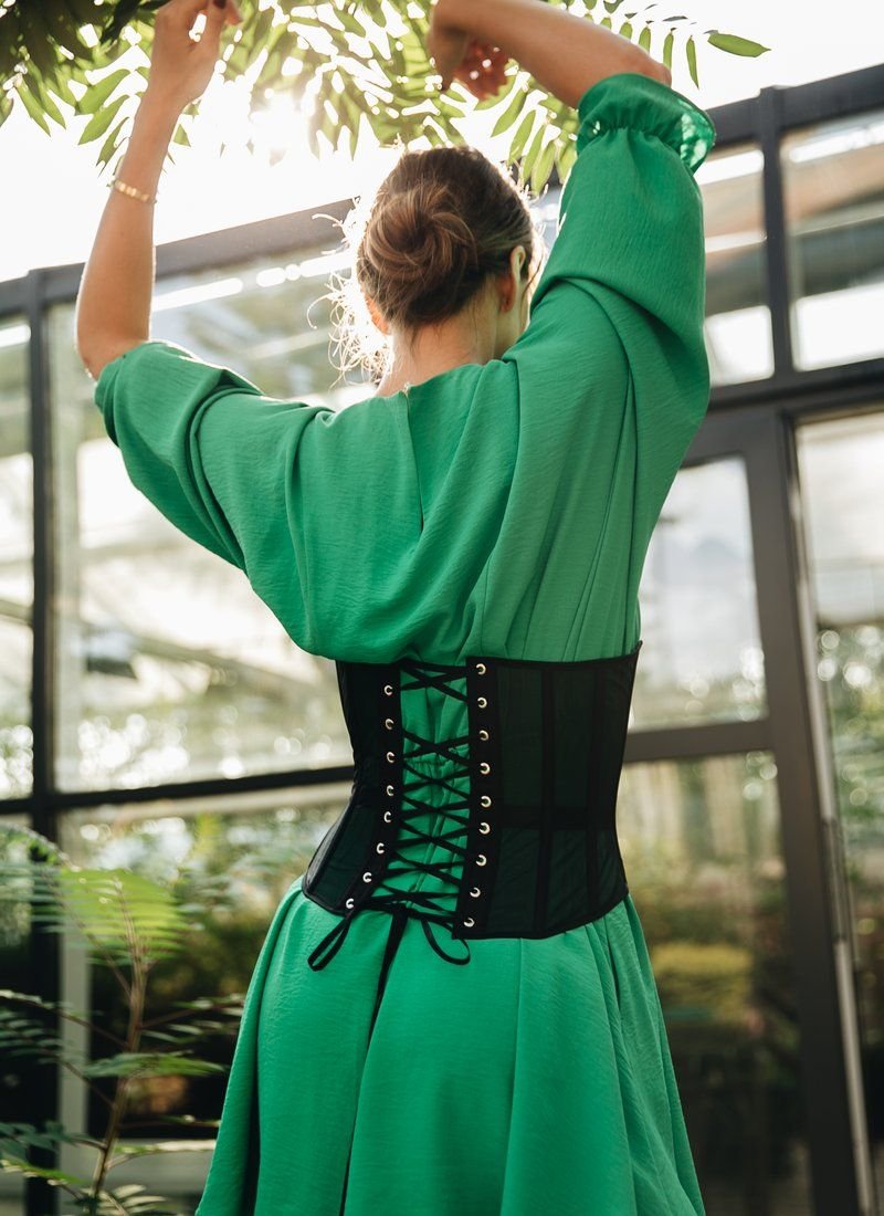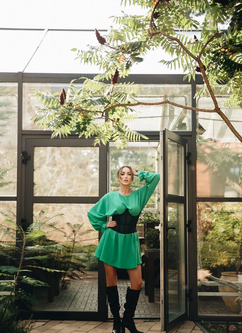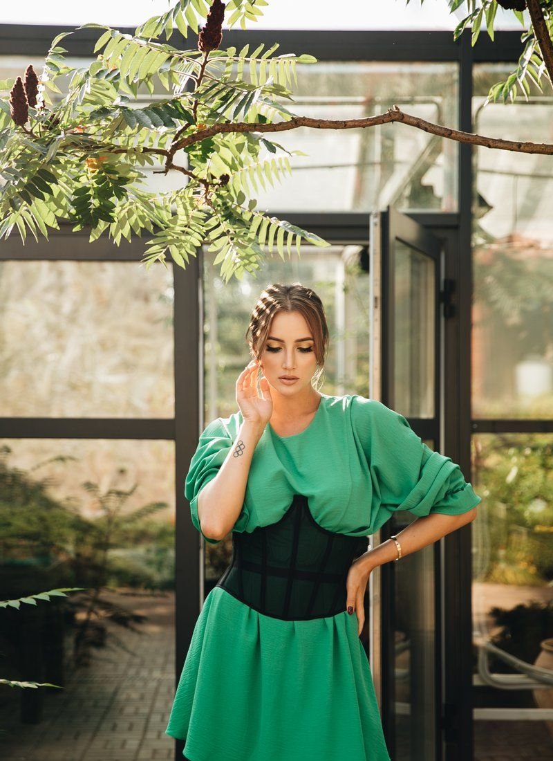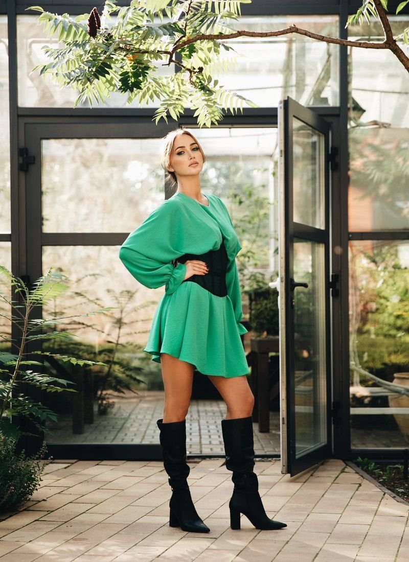 Gepur designers present their version of the green dress. A loose style with one-piece sleeves on elastic cuffs adds volume to the chest area. Elastic drawstring at the waist accentuates the waist. A small cutout with a button closure is made on the back. The collection was presented by Anna Rizatdinova, a Ukrainian gymnast, a bronze medalist of the Olympic Games in Rio de Janeiro, a participant of the show "Dancing with the Stars".