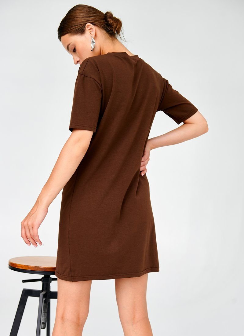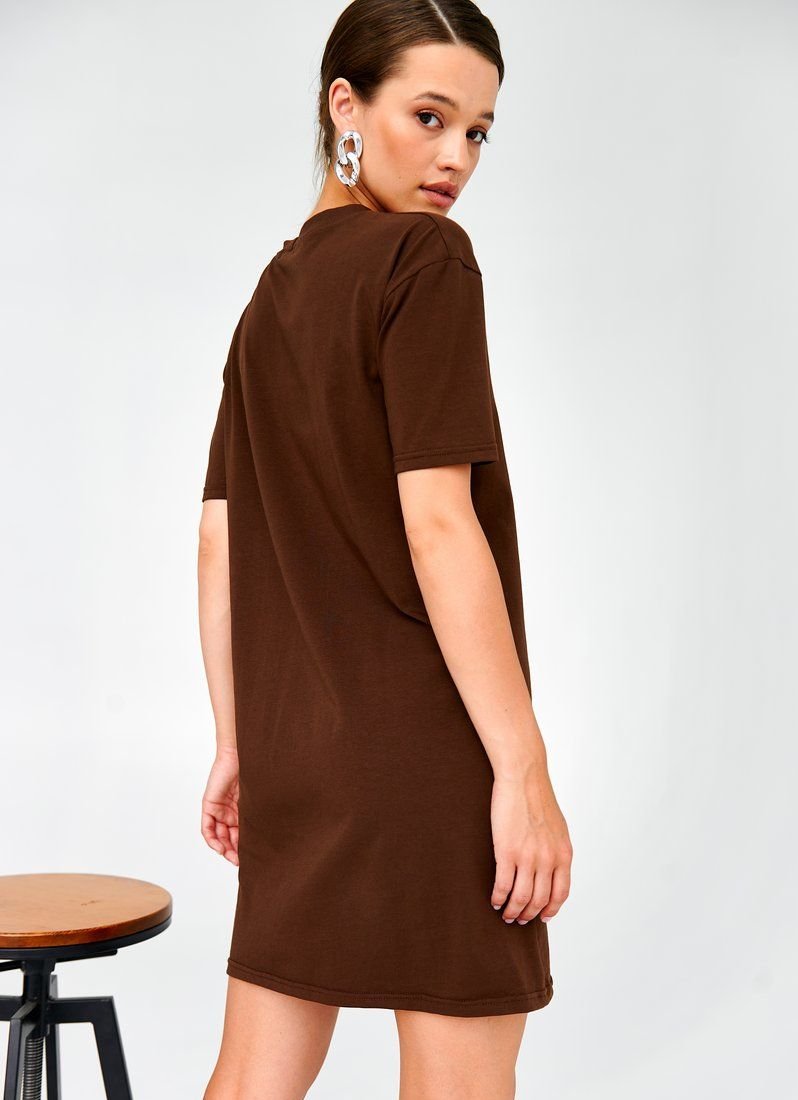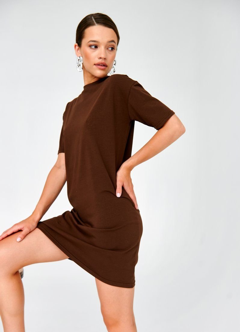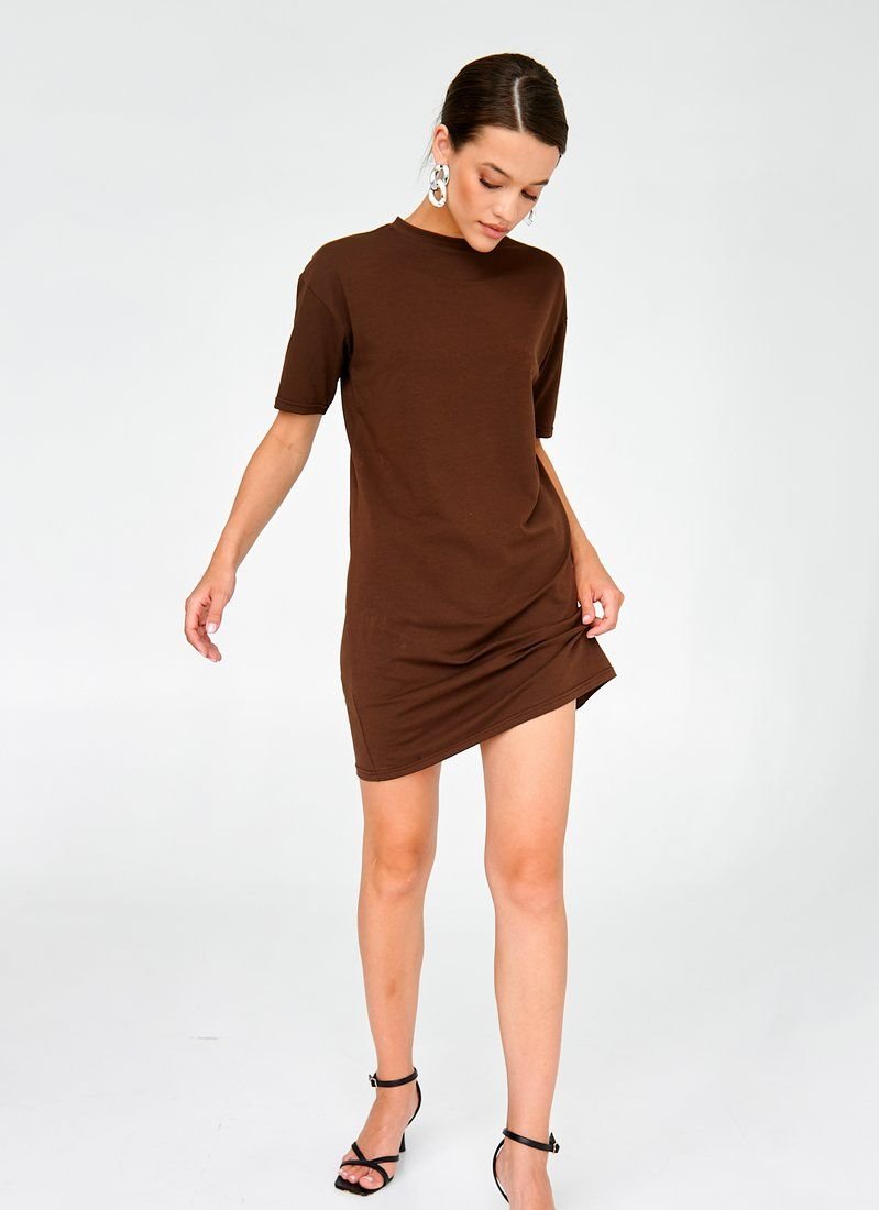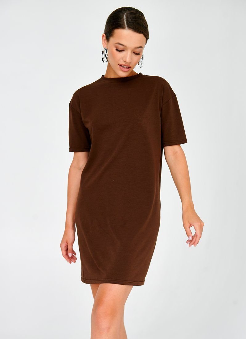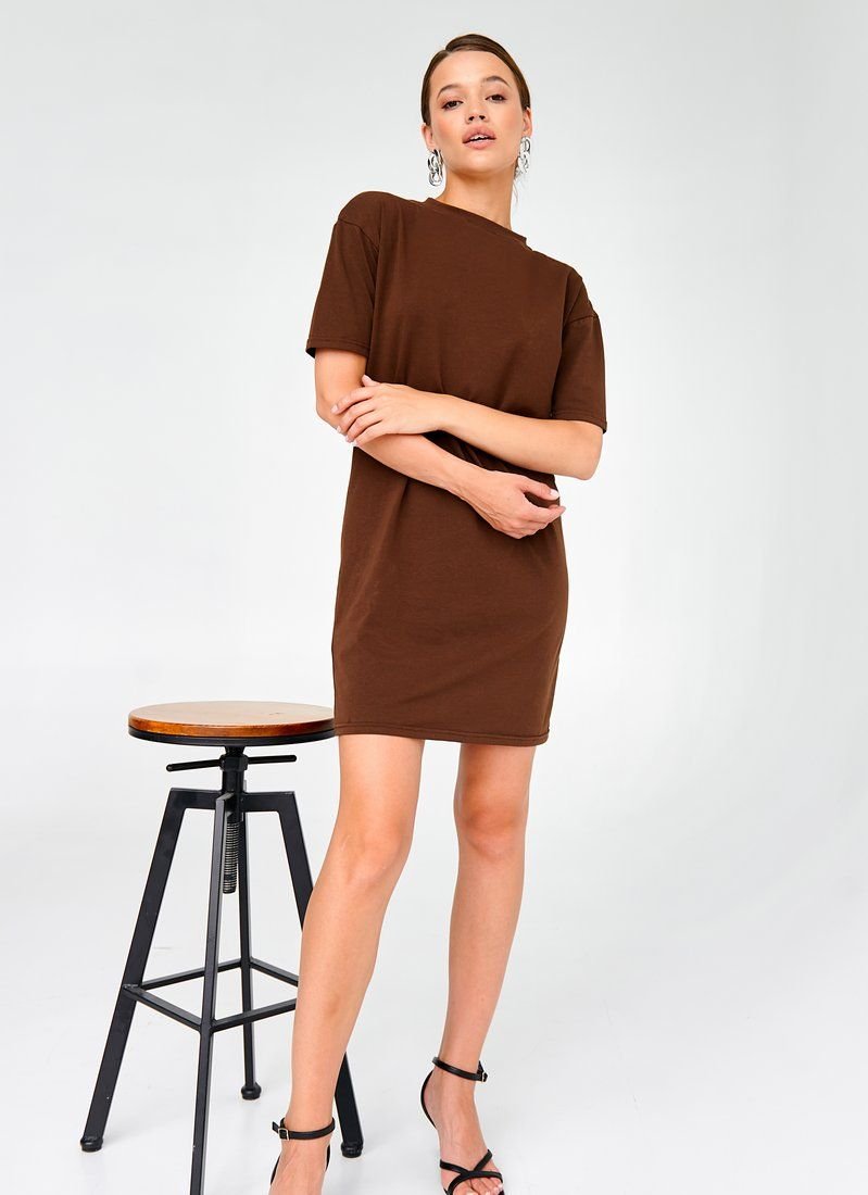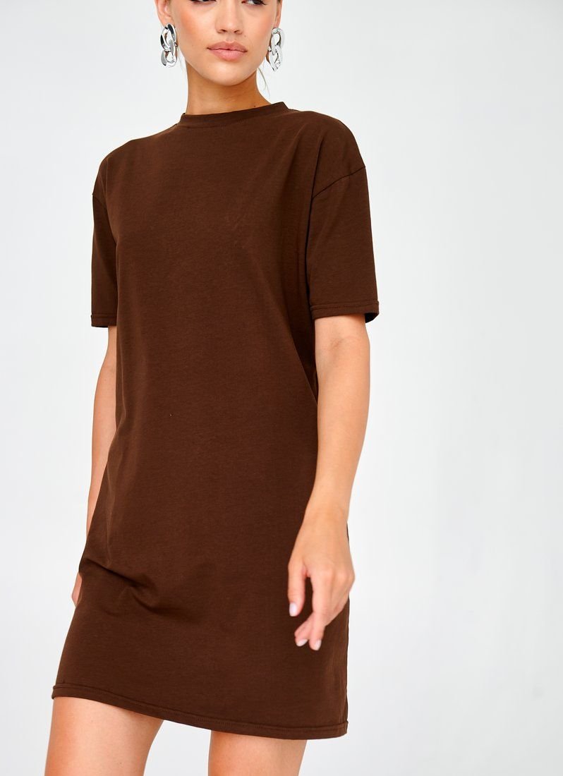 The basic dress is a cappuccino-colored T-shirt. Round neck, short sleeve, mini length. Such a thing will become the basis for your image, if you want to emphasize the waist, you can style it with a belt.