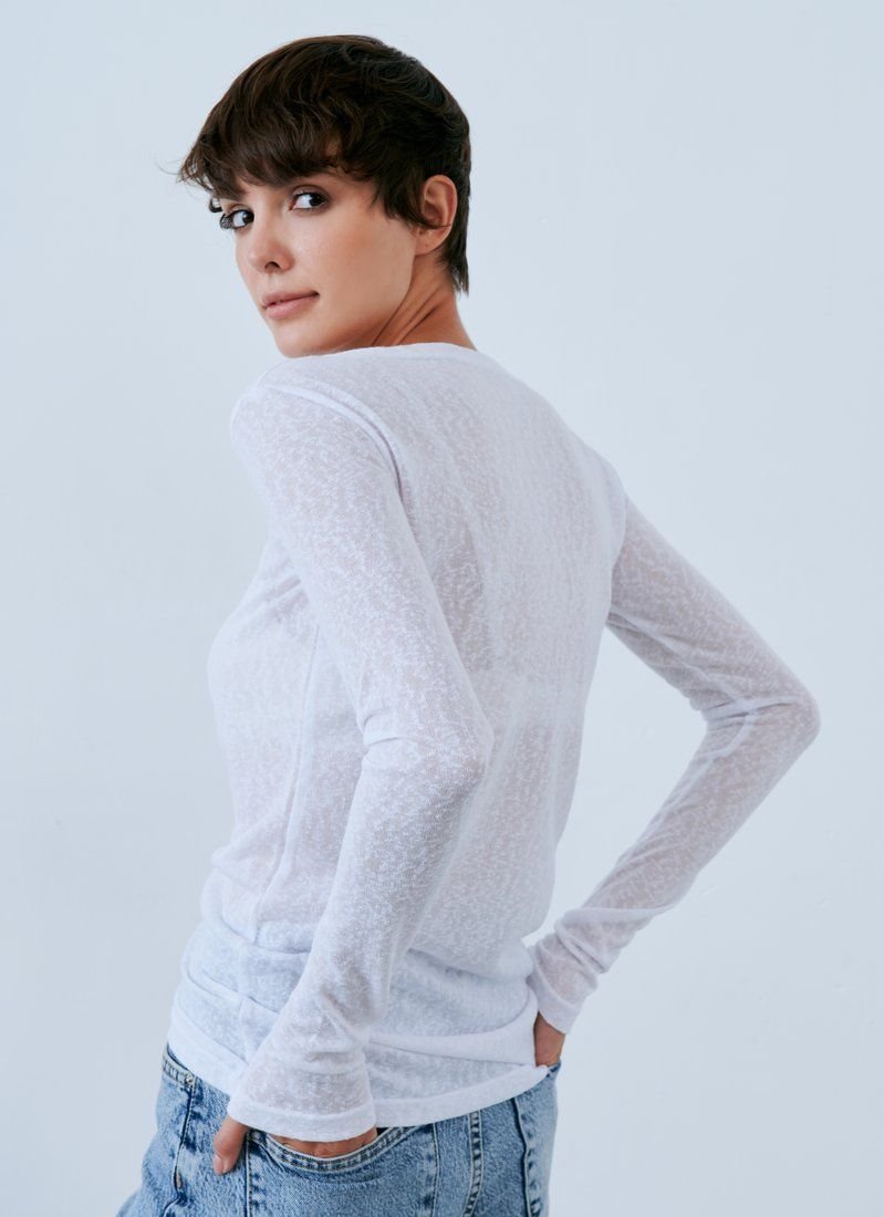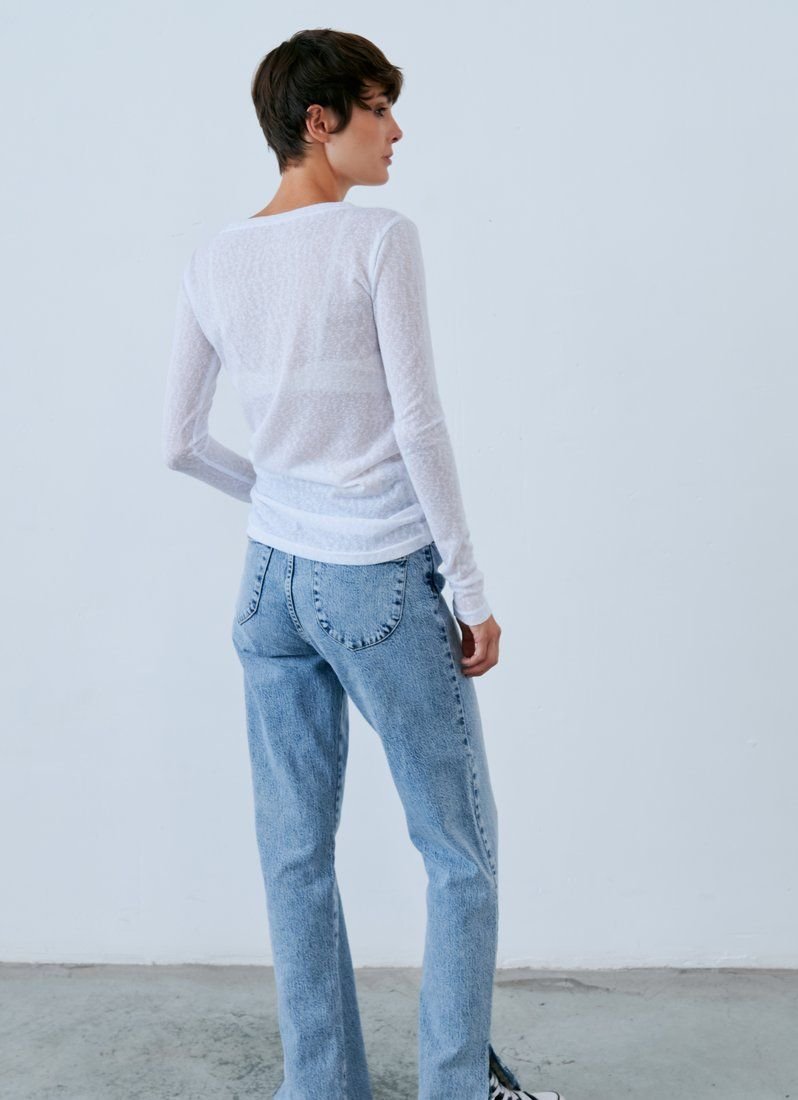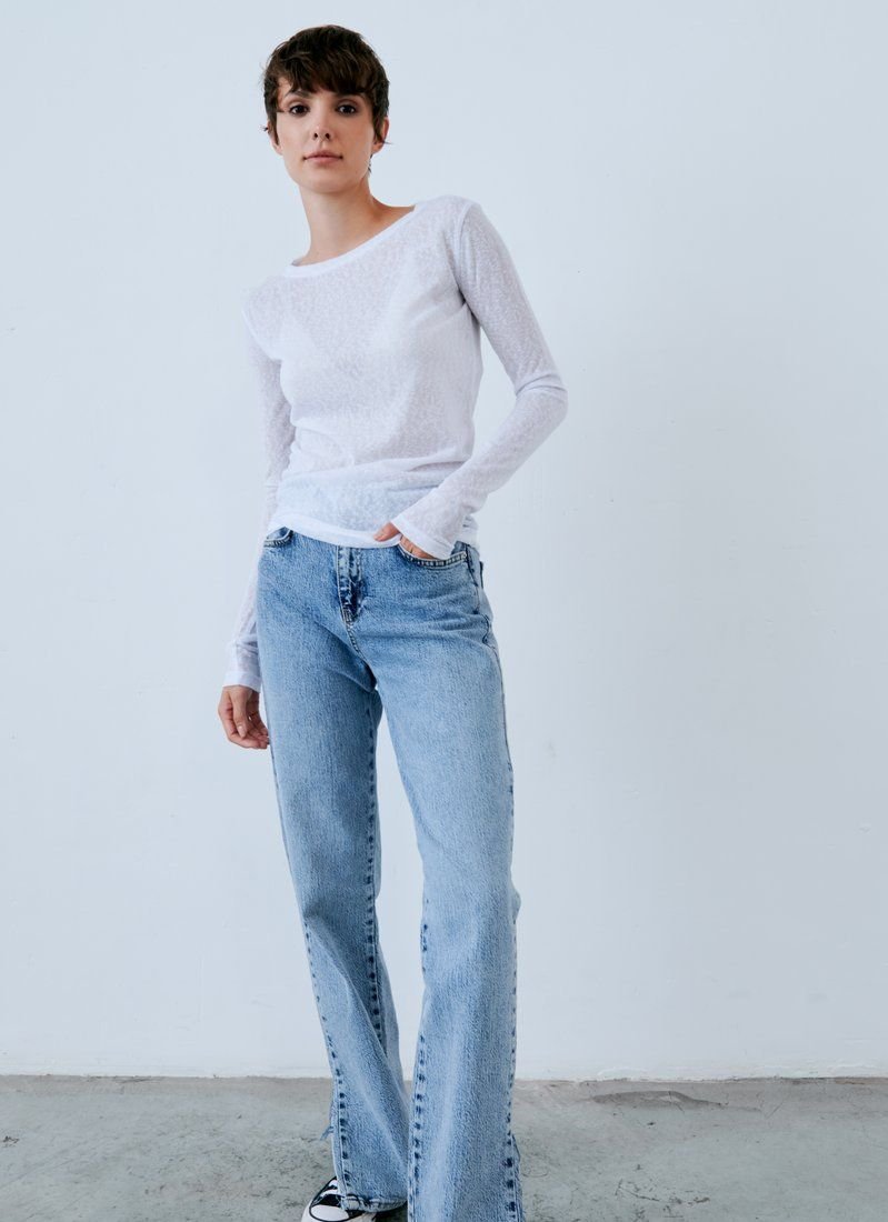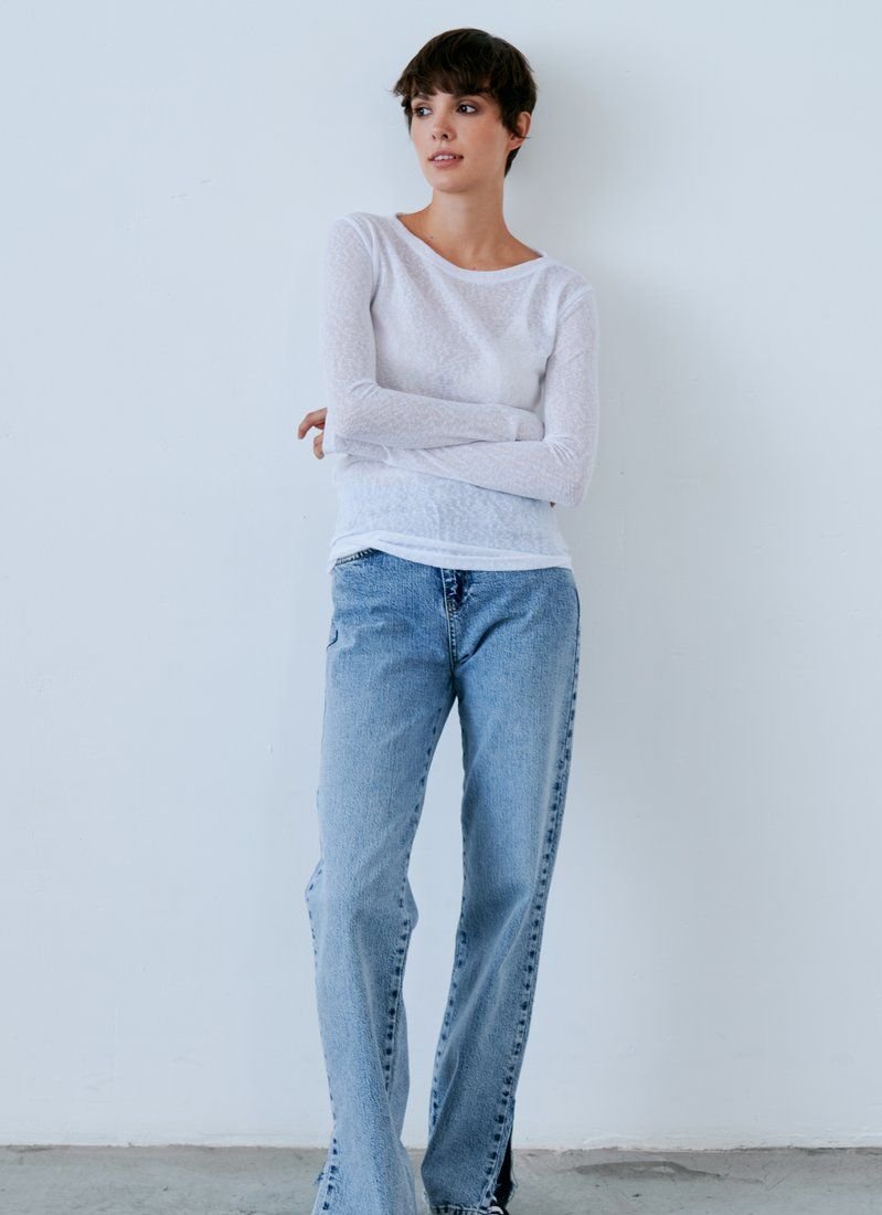Basic white longsleeve made of lightweight material. With such a thing in the wardrobe, you can combine many things to create stylish images.