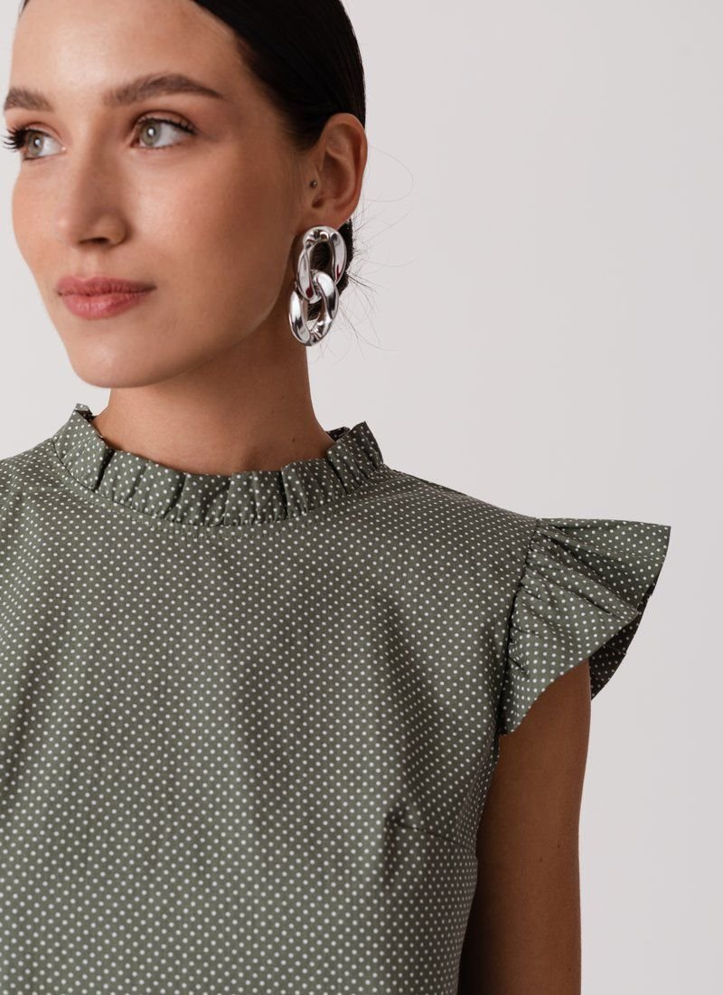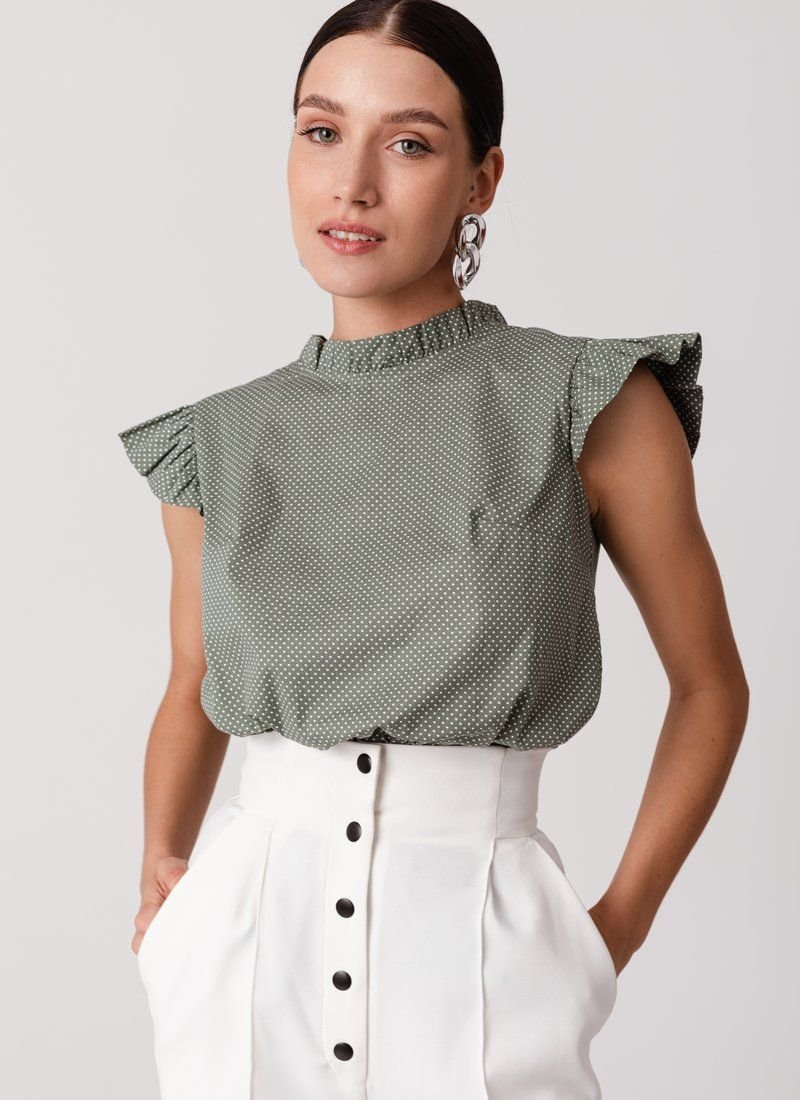 A loose silhouette, wing sleeves, a ruffled collar, wide ruffles and a print in small peas made the blouse as romantic as possible. Soft cotton material does not overheat the skin and allows you to feel comfortable.