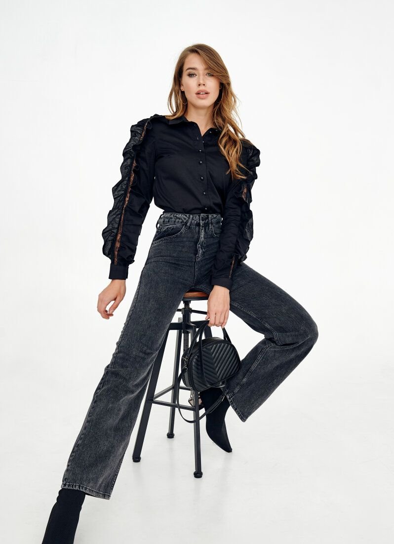 Despite the restrained black color, the blouse will solo in the image. The whole accent of the model consists in long sleeves with openwork inserts framed by flounces.
