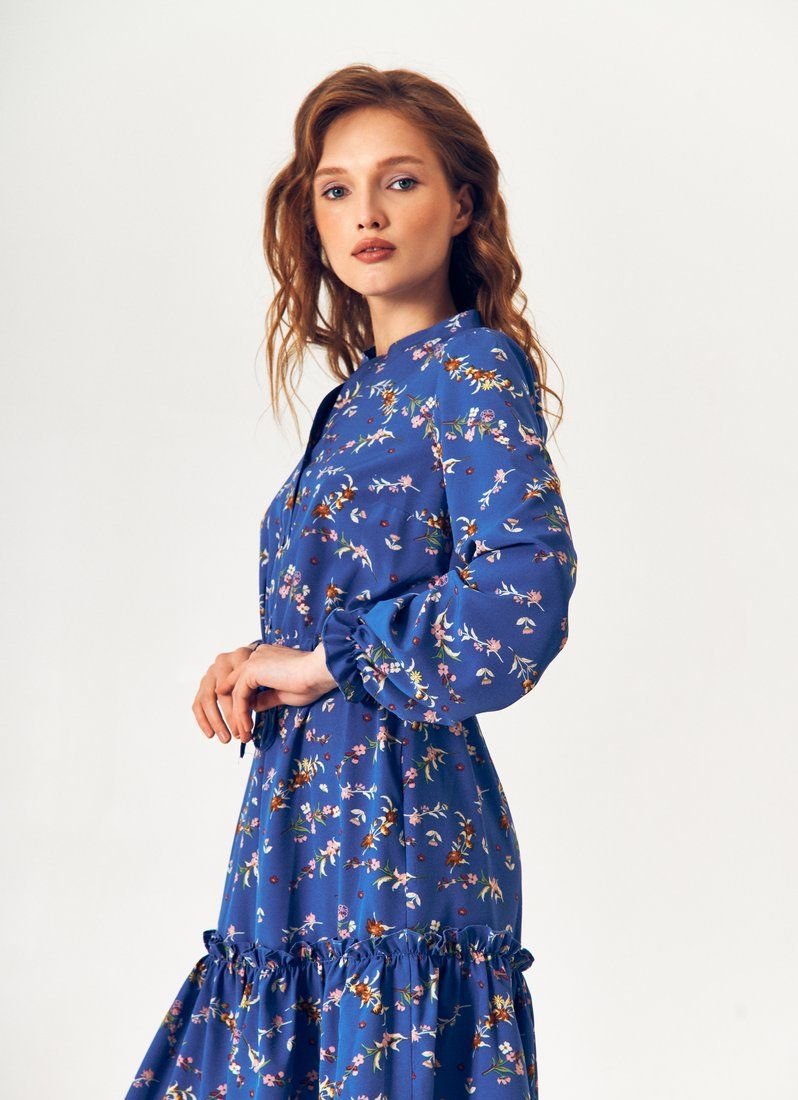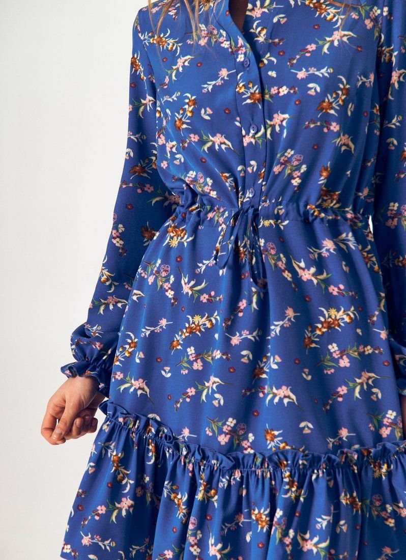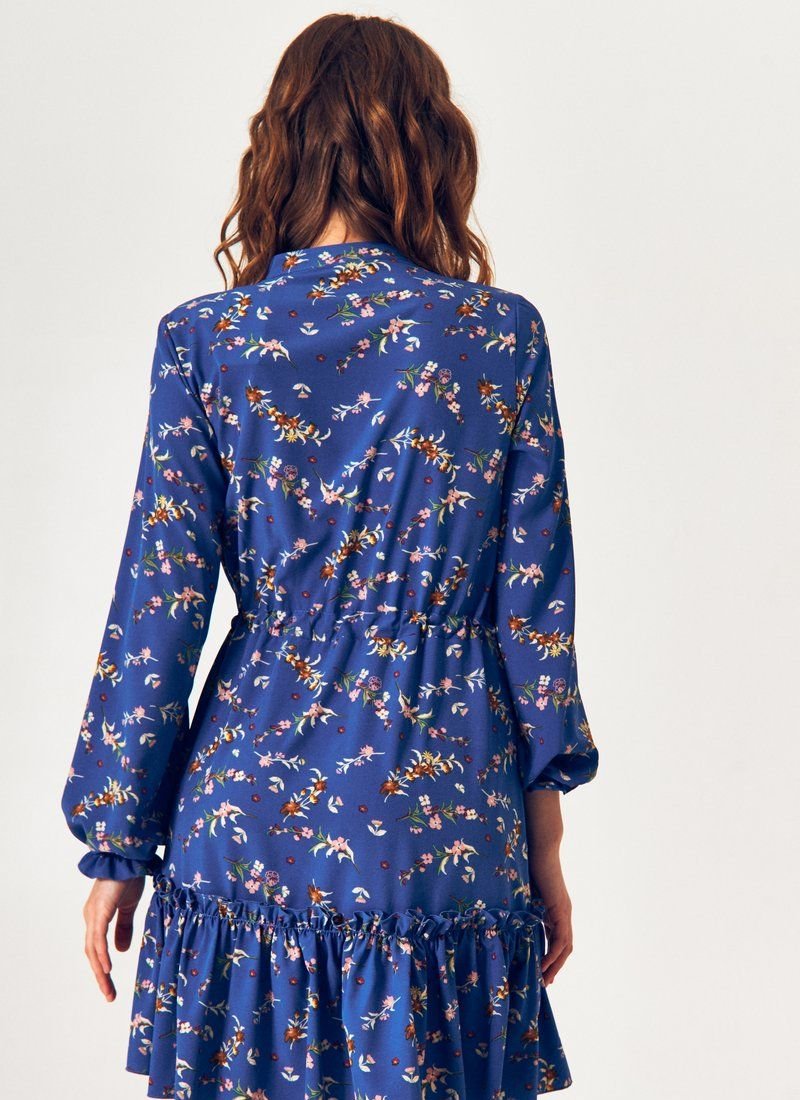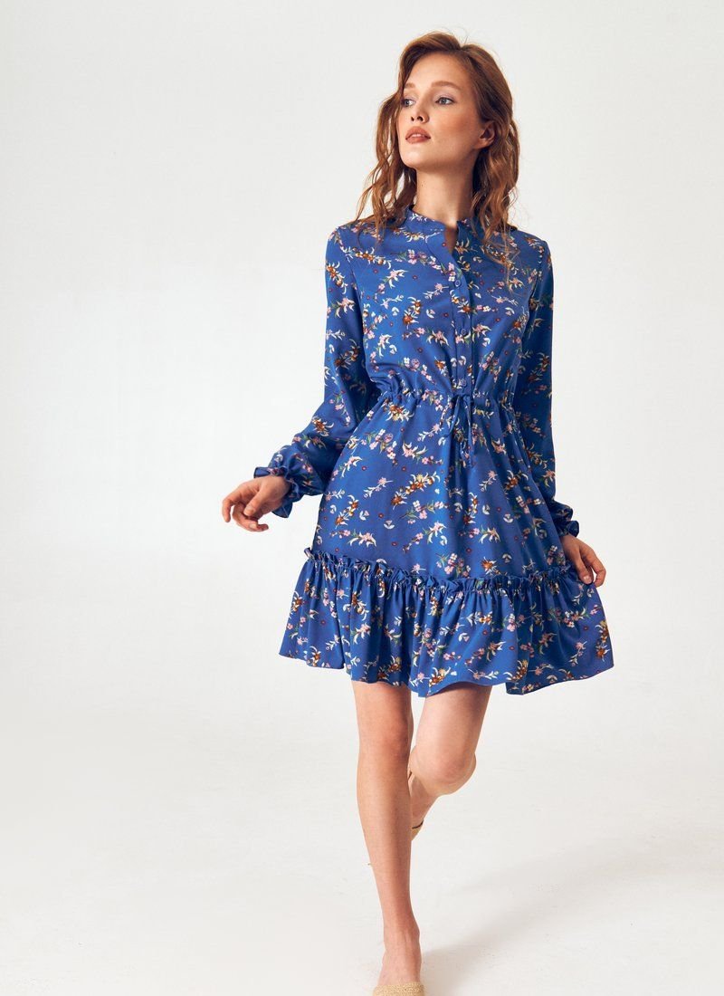 The blue mini dress is decorated with flowers, which have become an actual pattern of the SS'21 season. Models with this print could be found in the seasonal collections of Valentino and Balenciaga. The loose cut of the product was diversified with a drawstring at the waist and a flounce at the hem.