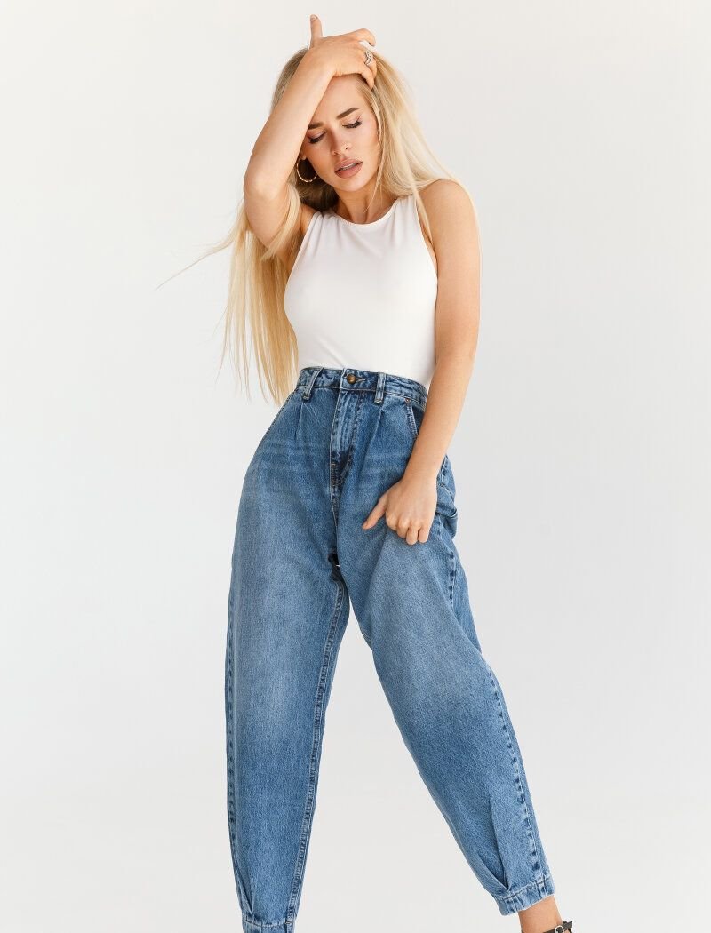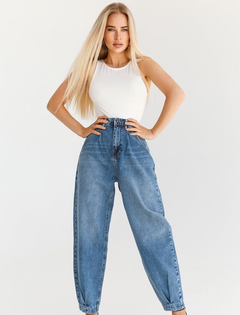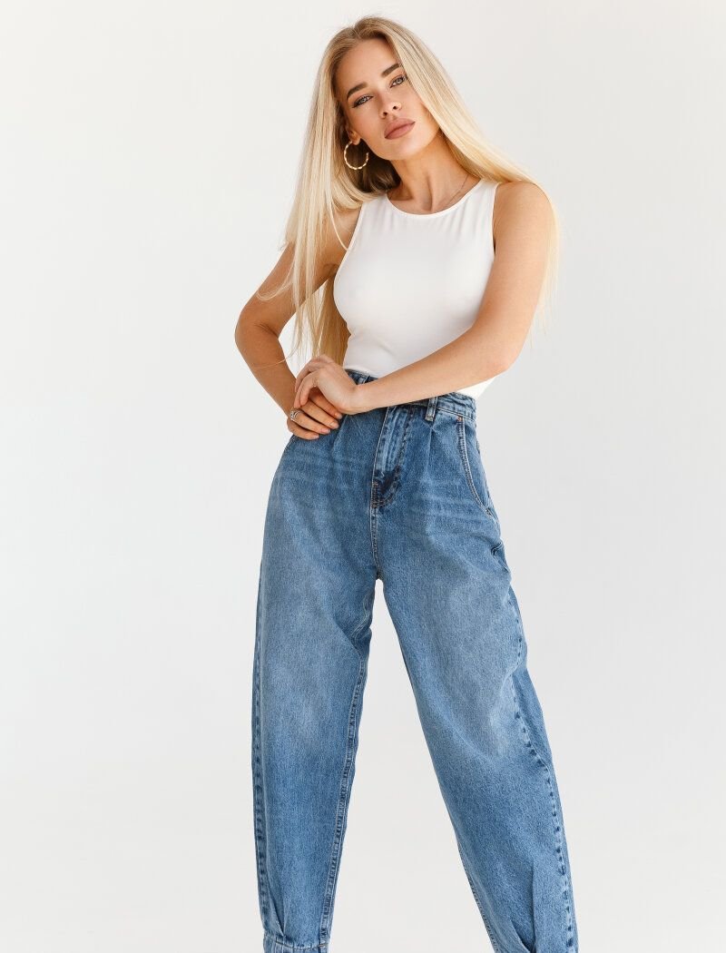 Gepur designers presented denim trousers of a trendy loose cut in a new collection in combination with a minimalistic bodysuit. The model with a high fit sits comfortably and emphasizes the waist.