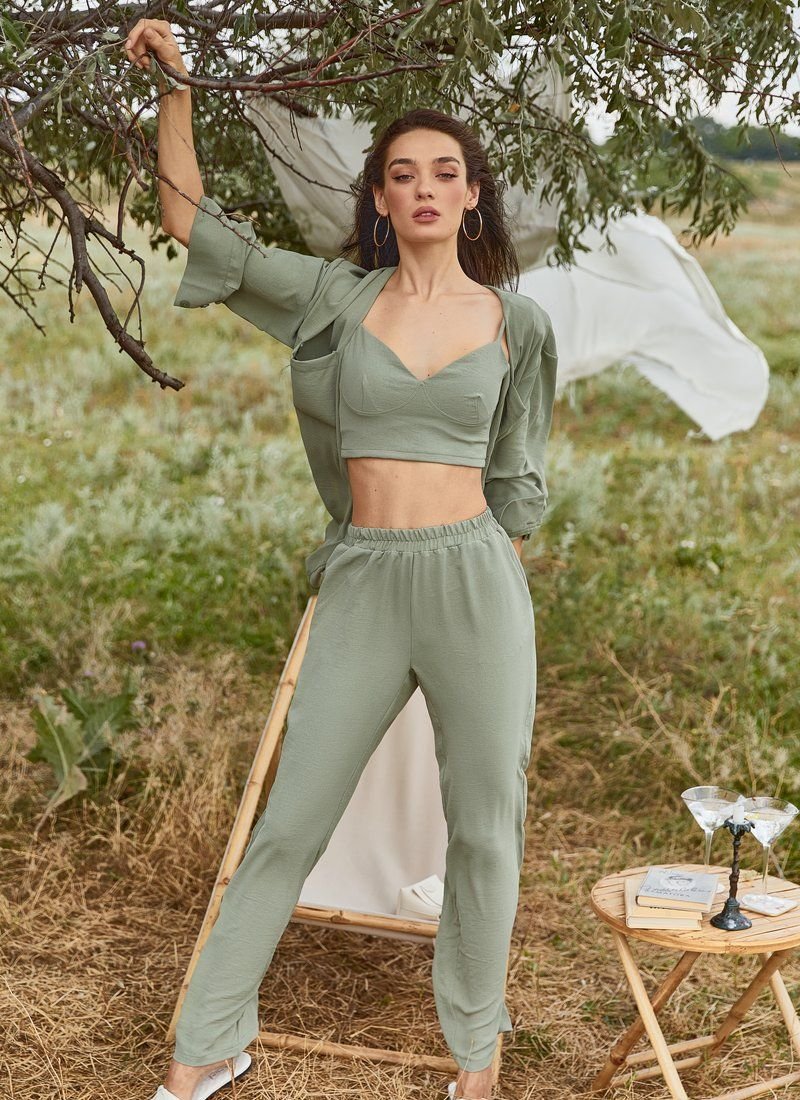 Summer three-piece set made of soft pressed fabric. The set includes a loose-fitting shirt with a chest pocket, medium-fit trousers with an elastic waistband and two pockets on the sides and a crop top with an elastic back and adjustable straps.