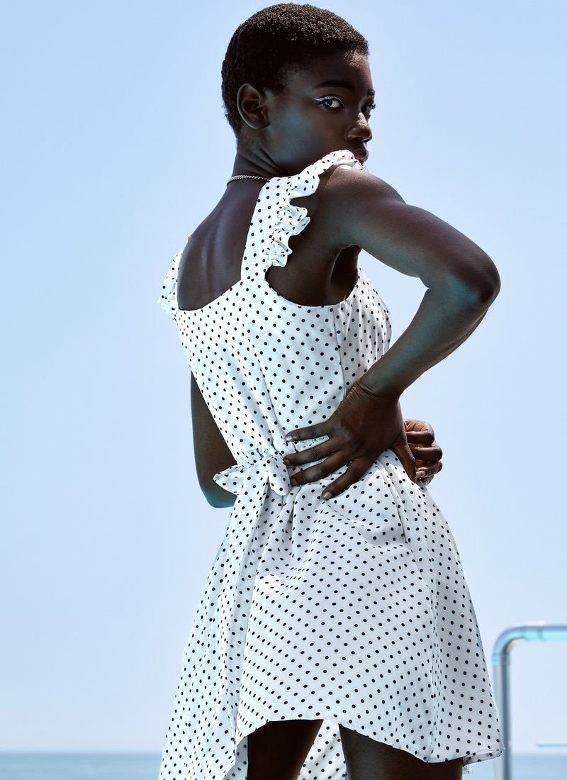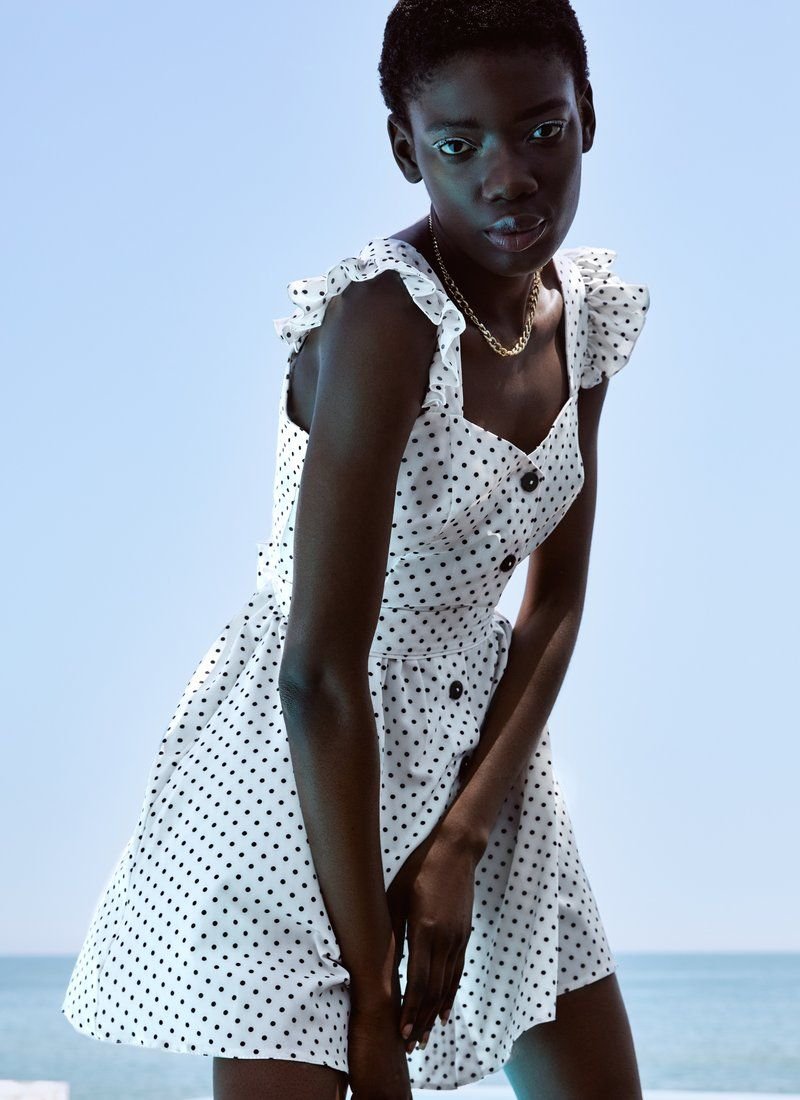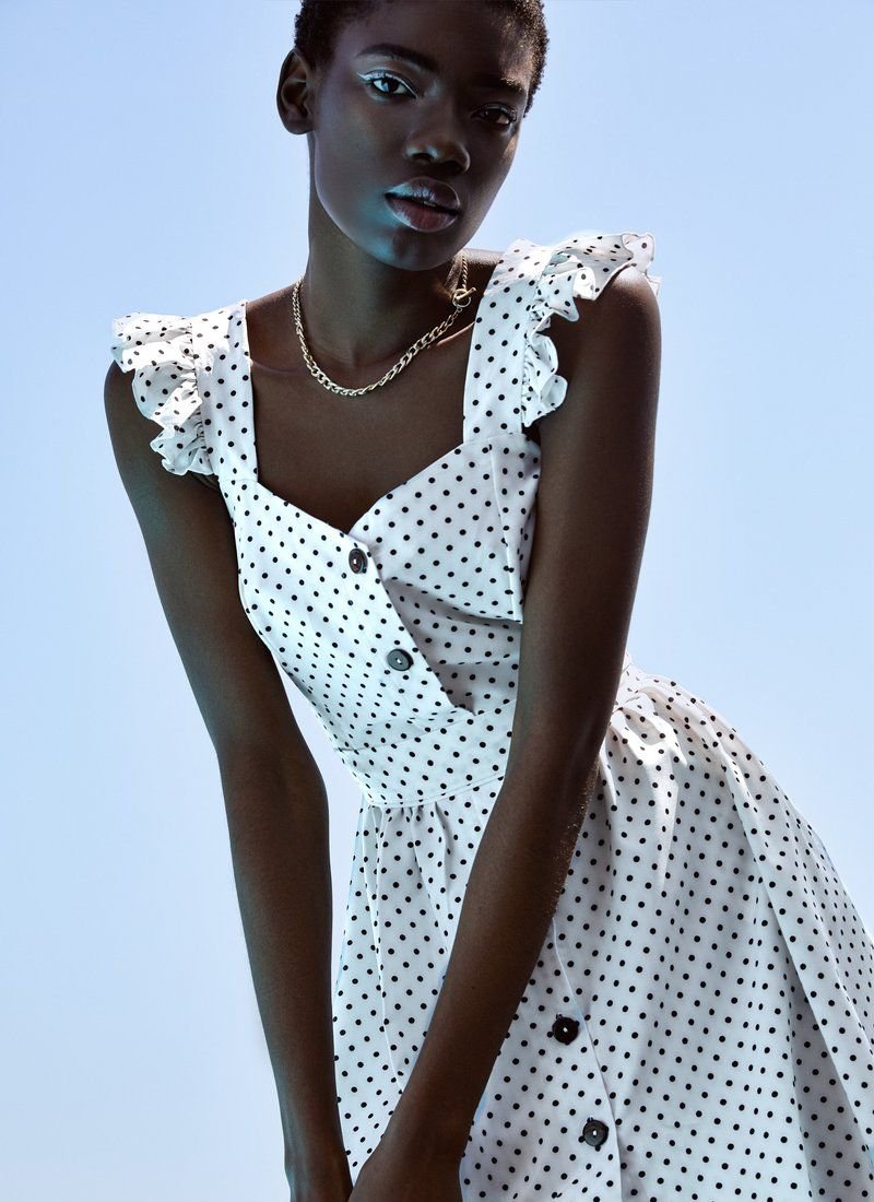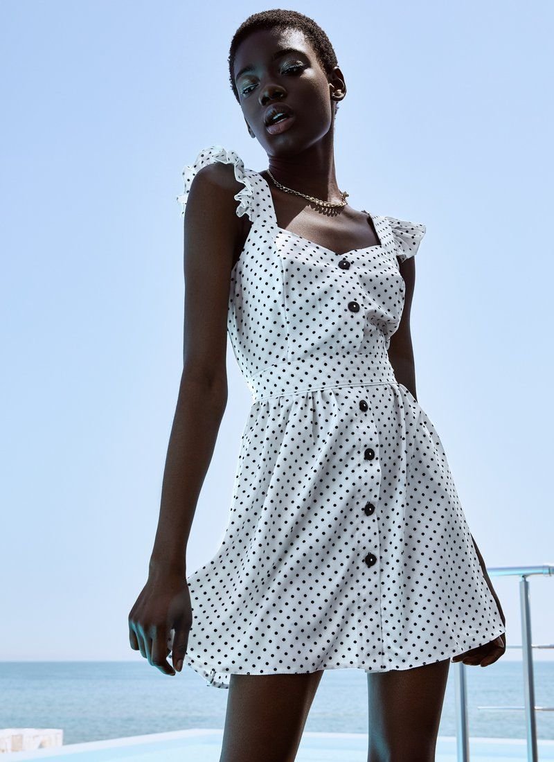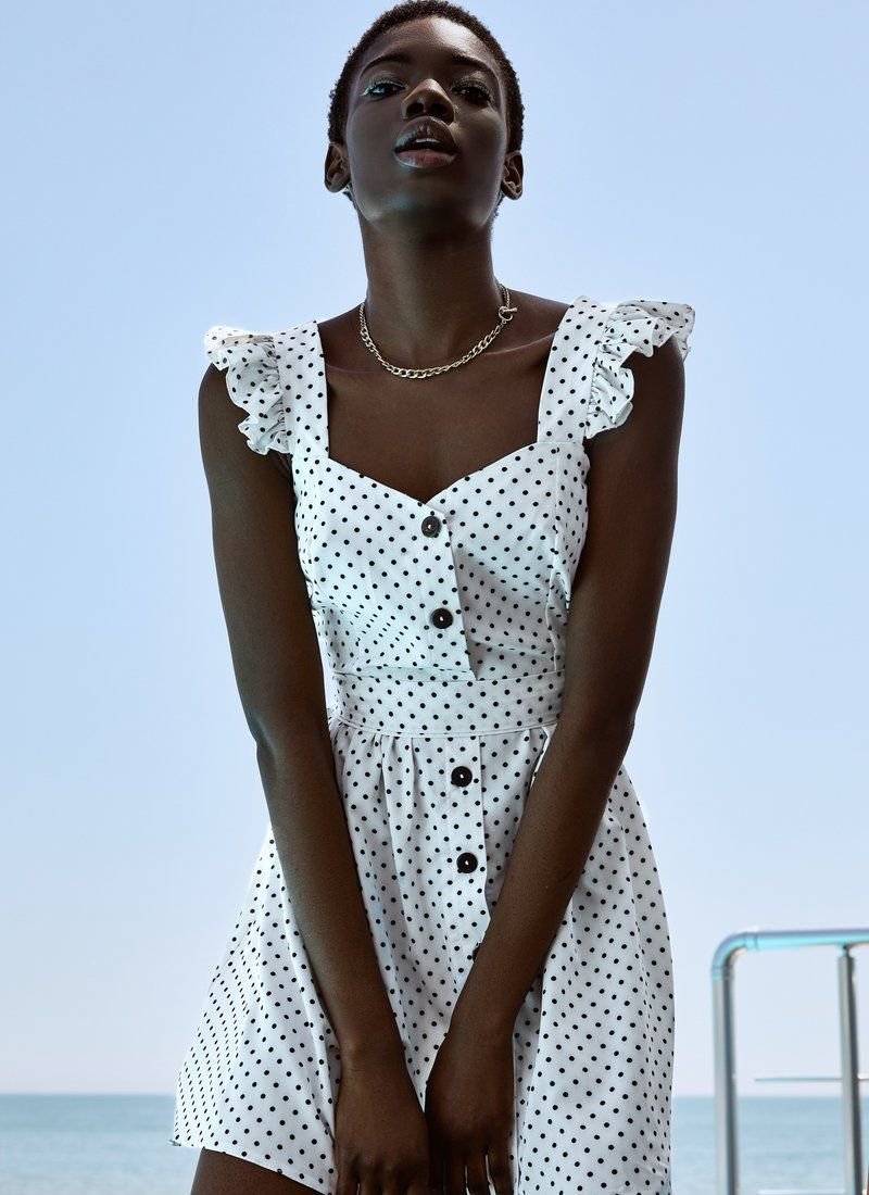 Polka dot is a versatile print that quietly gets along in different styles: from restrained and elegant to fun and relaxed. A fitted white sundress in small peas belongs to the latter. Wide straps are complemented with ruffles. The set includes a belt-ribbon that puts an emphasis on the waist.