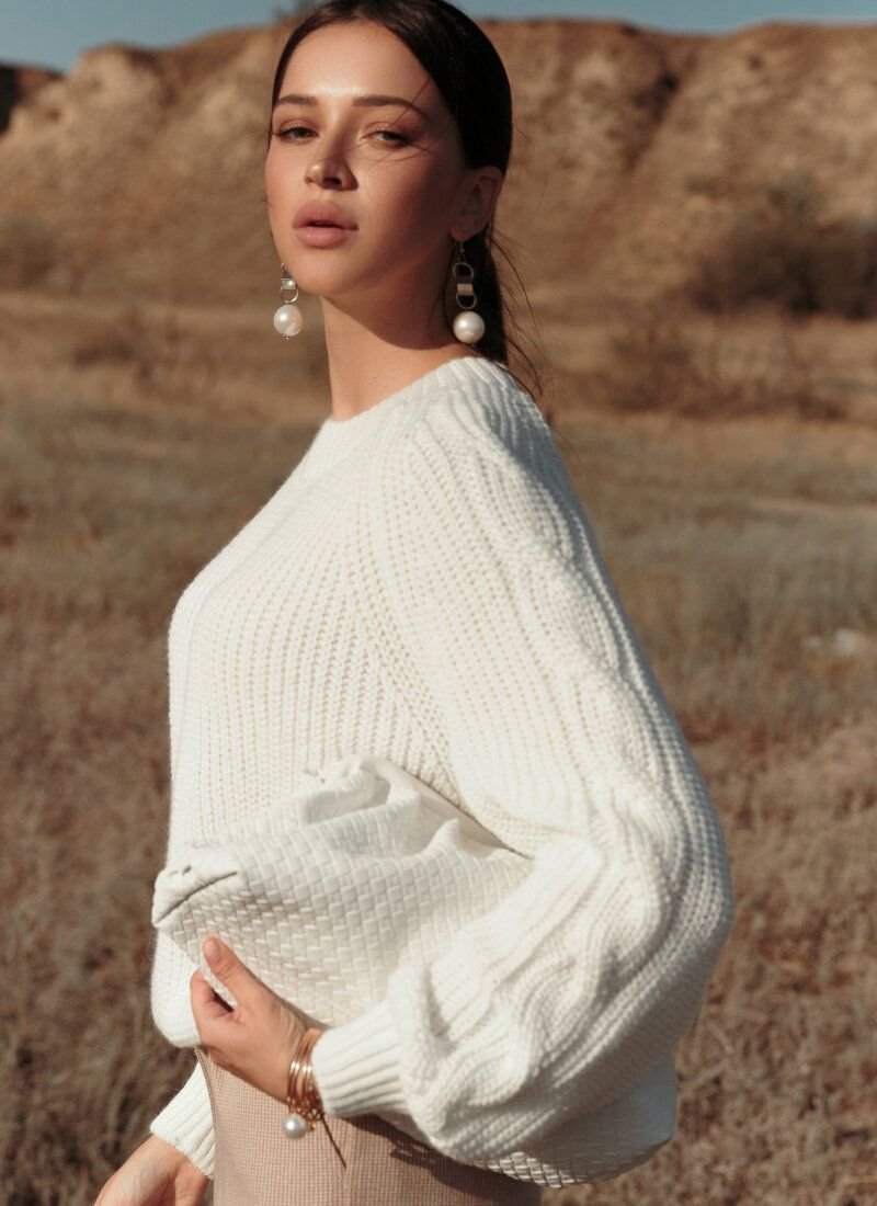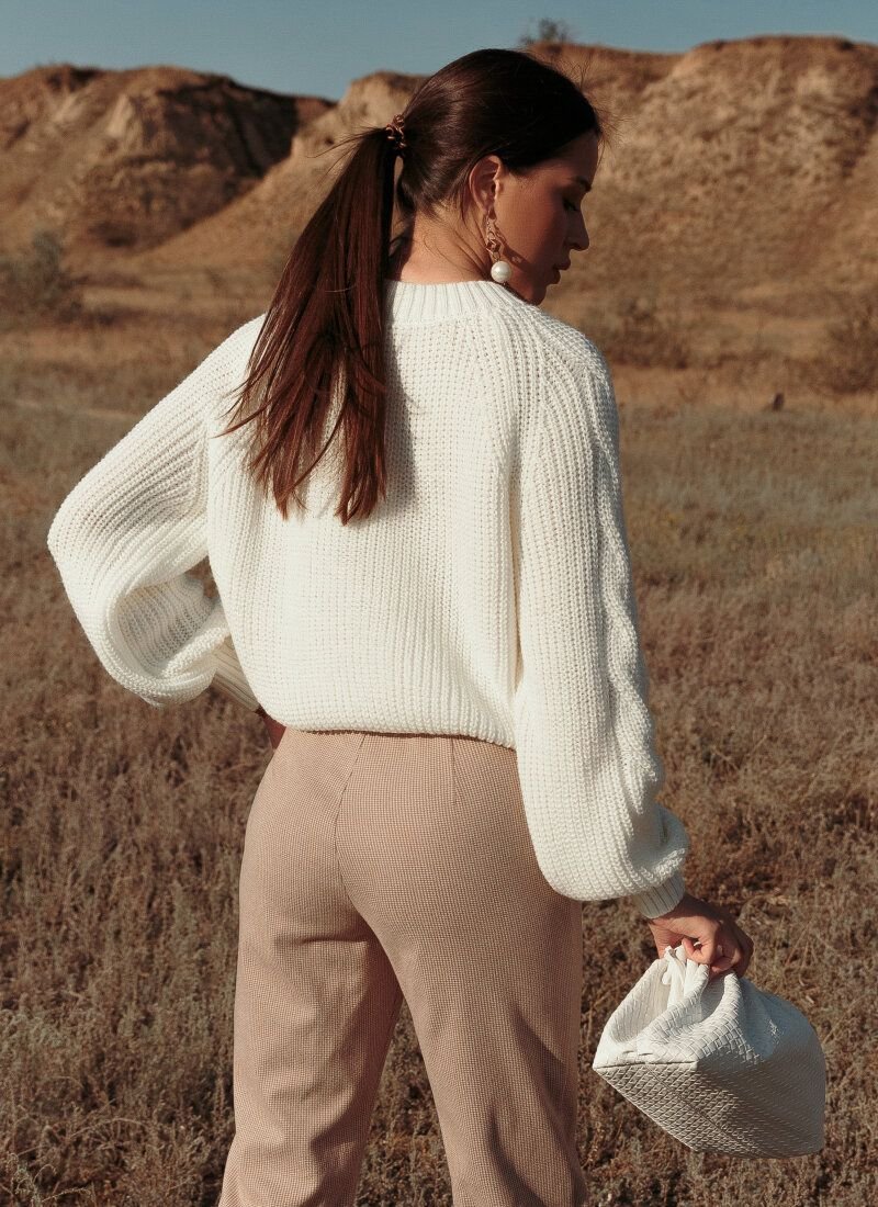 A white jumper can make any image cozy. The secret lies in a soft, pleasant yarn based on wool, which does not prick and at the same time warms. The knitted fabric looks voluminous and gives the model texture. Elastic cuffs on the sleeves and the bottom edge provide a comfortable fit.