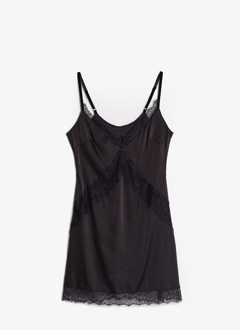 An elegant silk combination from Gepur designers on thin velvet straps, with a deep v-neck and lace decor.
