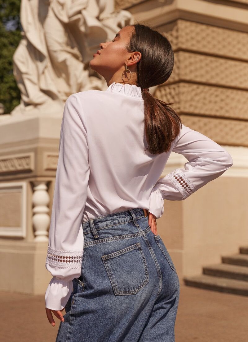 A white shirt with a loose cut, decorated with lace. Made of light flowing fabric. Classic turn-down collar, frilly yoke and long sleeve with elastic insert and flounce.
