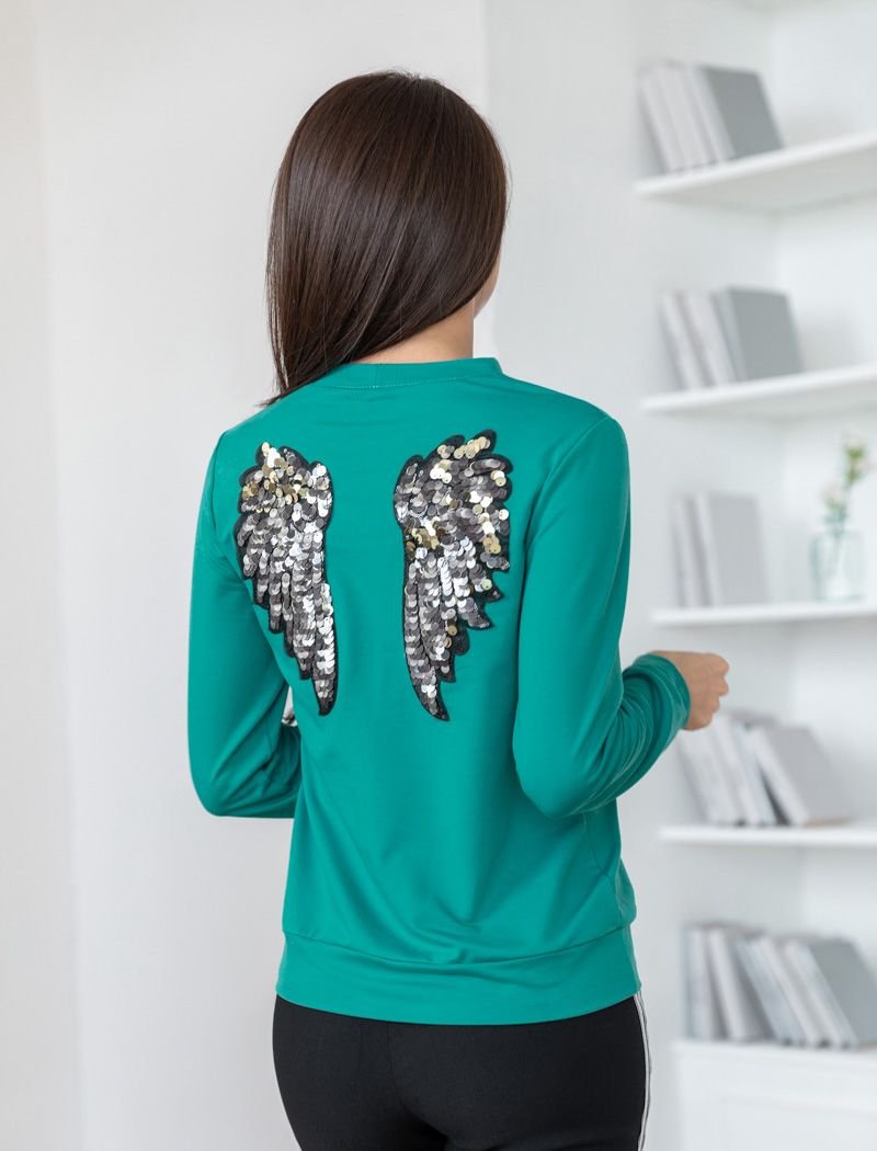 Casual knitted sweatshirt with a classic round neckline, long sleeves, elastic waistband and bold figural decoration on the back....