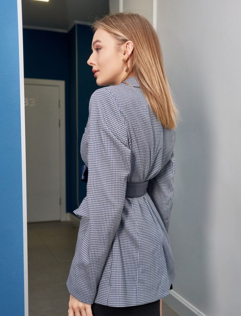 Single-breasted jacket with a classic ornament and silk lining. Turn-down collar with lapels|long sleeves and two welt pockets with a flap|complemented by a belt made of eco-leather.