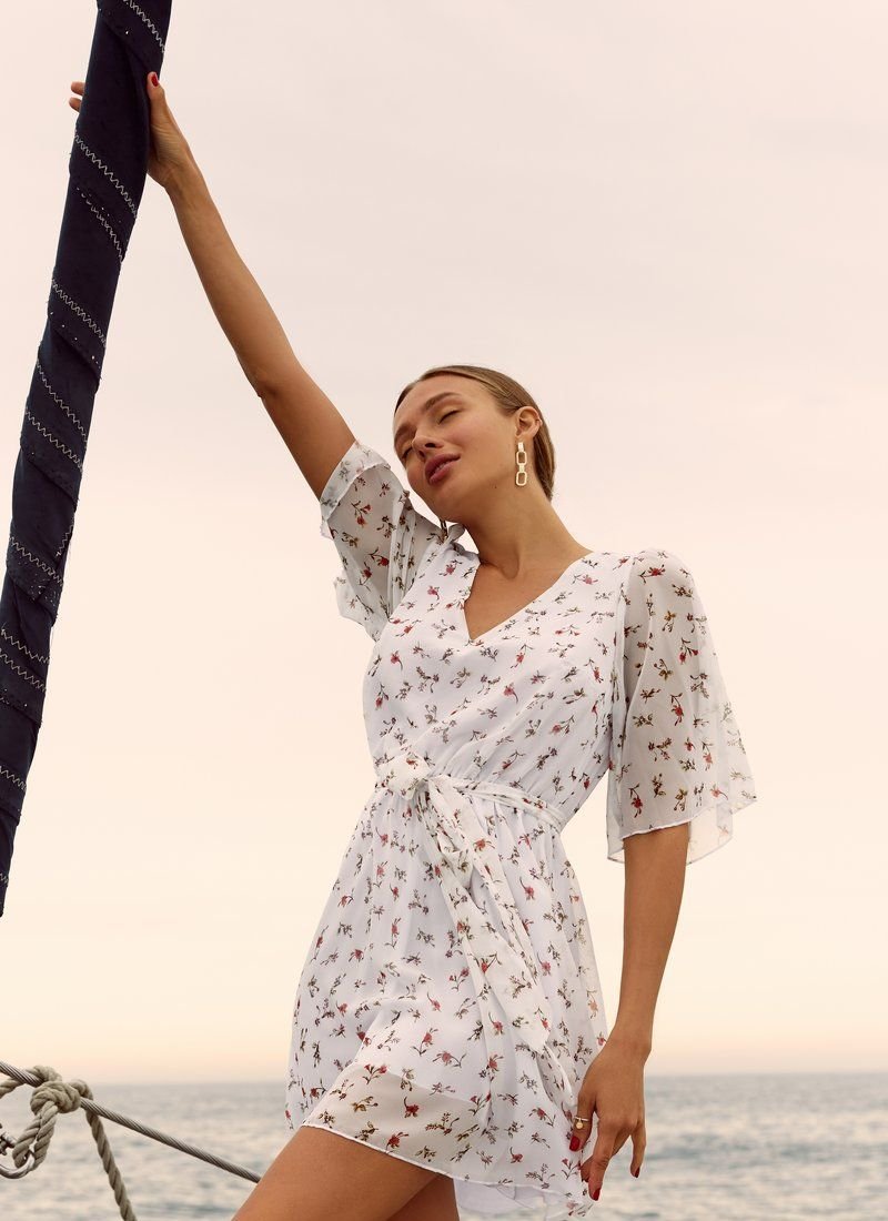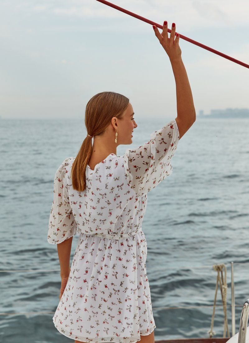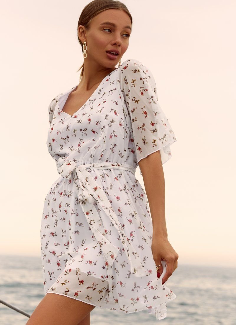 Airy white dress with floral print, made of light chiffon fabric. A neat v-neck on the chest, a short flared sleeve, an elastic insert at the waist and a short skirt. This model has a removable belt-belt.