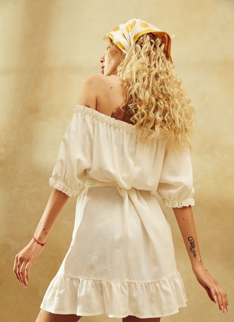 Summer dress of romantic cut, made of white linen. An open shoulder line with an elastic insert, a short sleeve with a cuff and a short loose skirt decorated with frills at the hem. The dress is complemented by a removable belt-ribbon, which emphasizes the waistline.