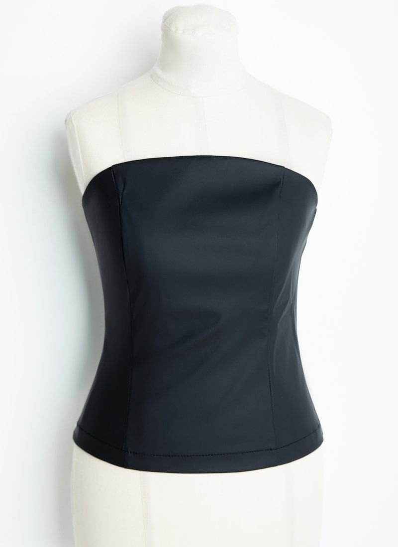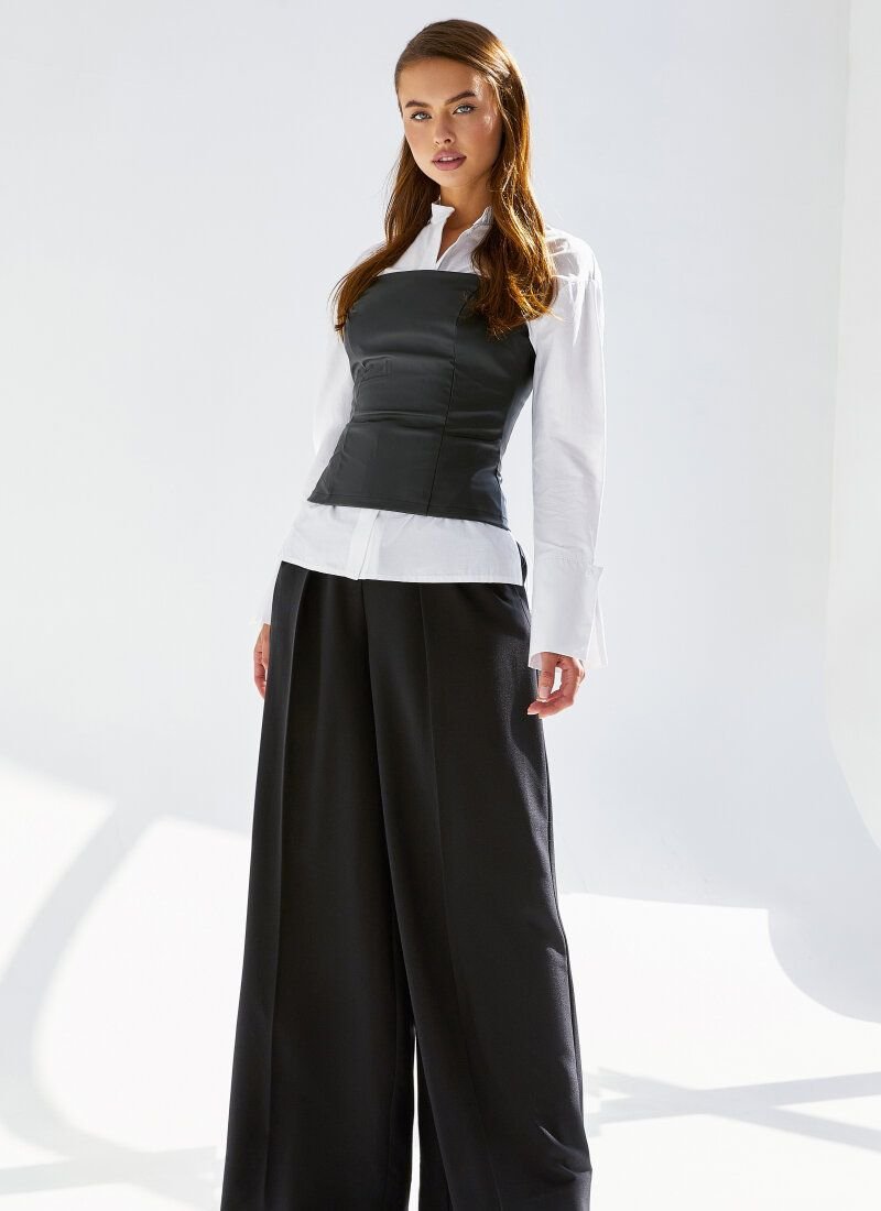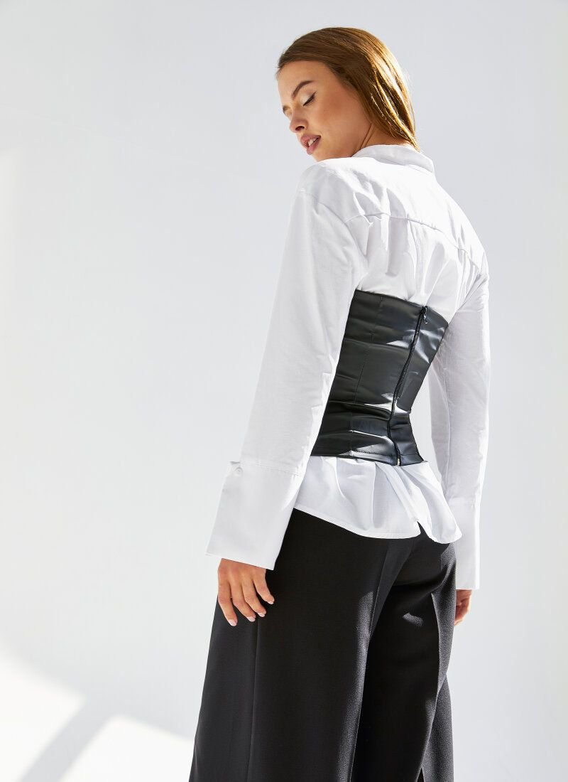 The image in black and white often looks too strict. But not if you make it around the corset. We compensated for the seriousness of the image with the help of a leather texture, which holds the leadership in the trends of the 2021 season. The product is fastened with a hidden zipper at the back.
