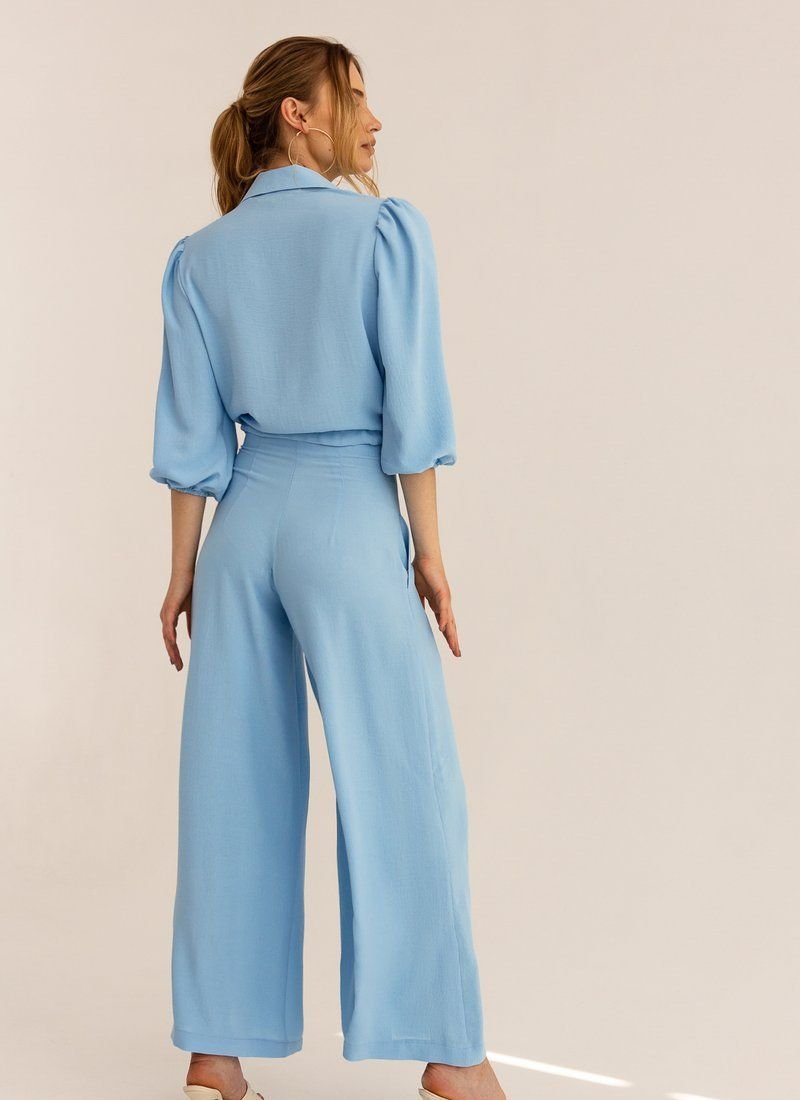 The suit with a jacket and flared trousers is made of a lightweight material that allows the skin to breathe in hot weather. The loose cut of the model supports the most up-to-date silhouette in SS'21. The jacket was complemented with a turn-down collar with ruffles and a drawstring at the bottom edge.