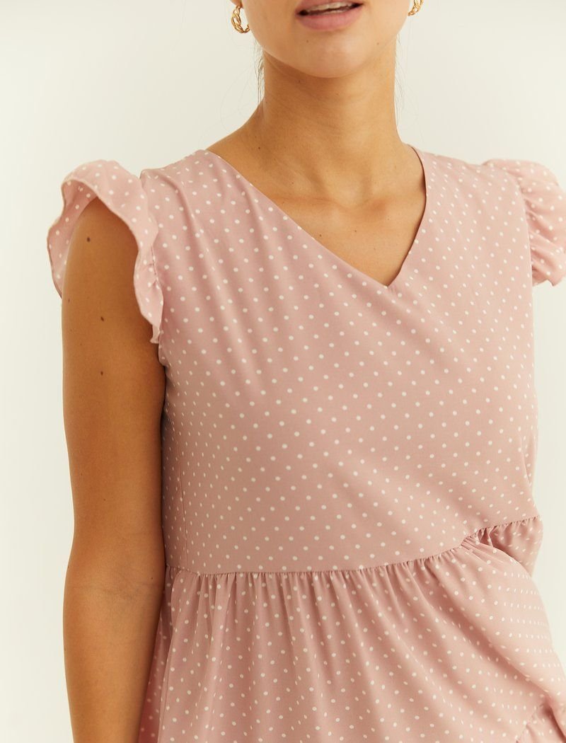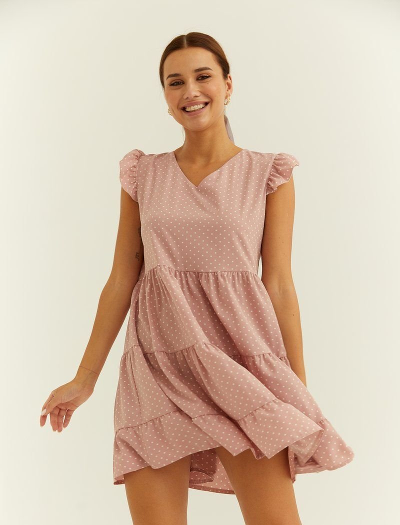 A short dress of a powdery shade, made of flowing fabric. A small v-shaped neckline on the chest, short wing sleeves and a multi-tiered skirt, which gives the dress lightness. The model is decorated with a contrasting print in small polka dots.
