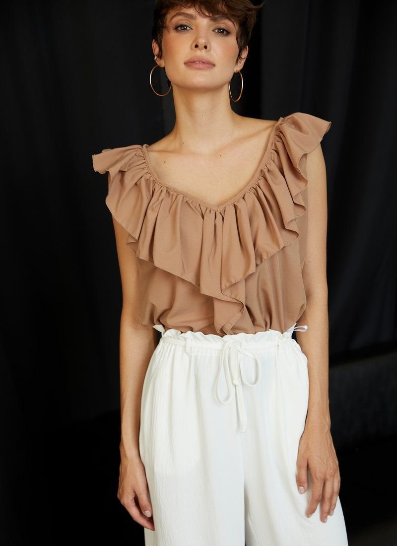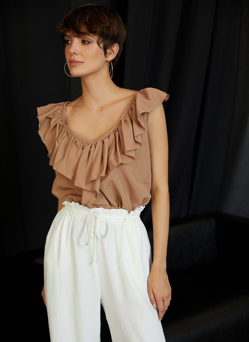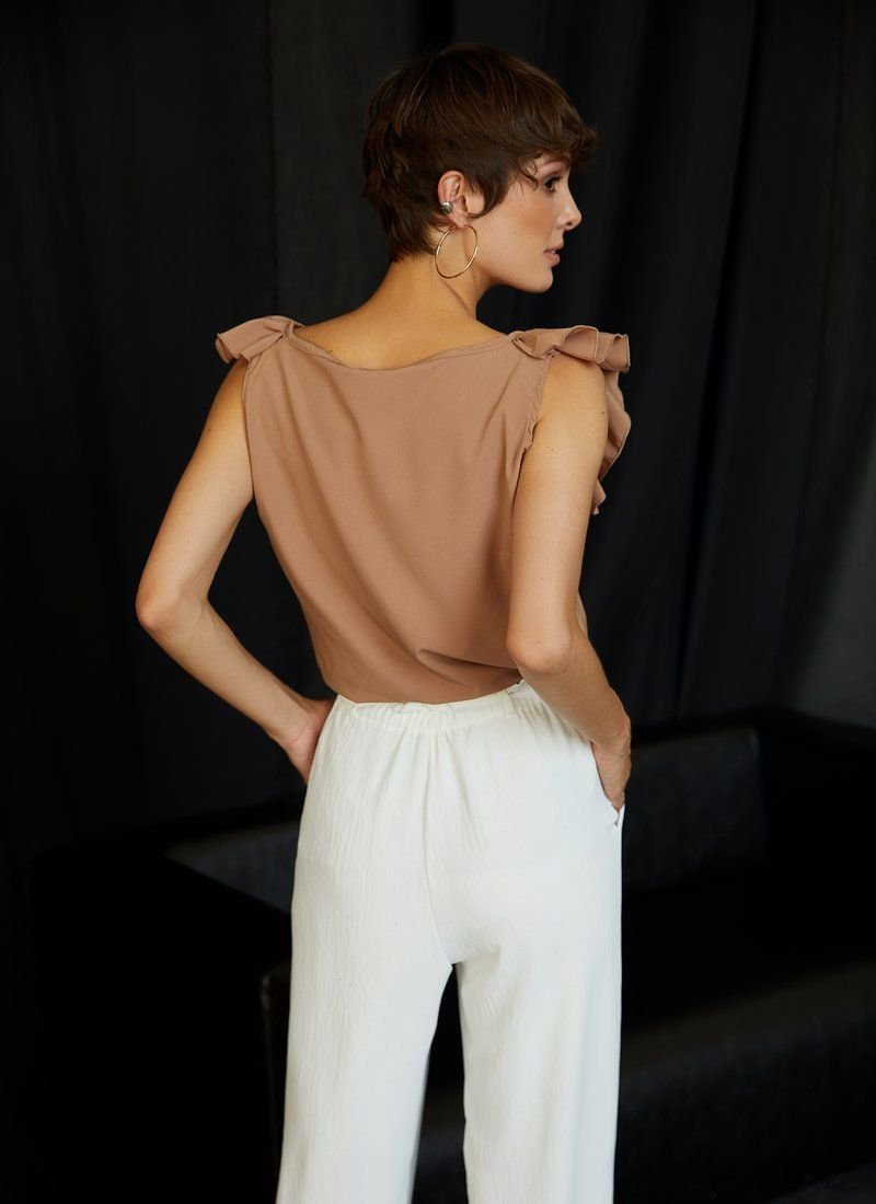 A beautiful beige blouse without sleeves, a loose cut with a v-neck, which is decorated with voluminous ruffles. Perfect for everyday looks, and can also complement an outfit for an evening out.