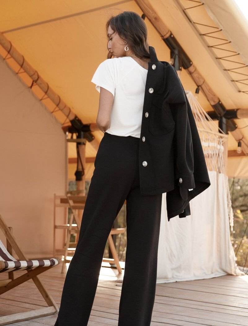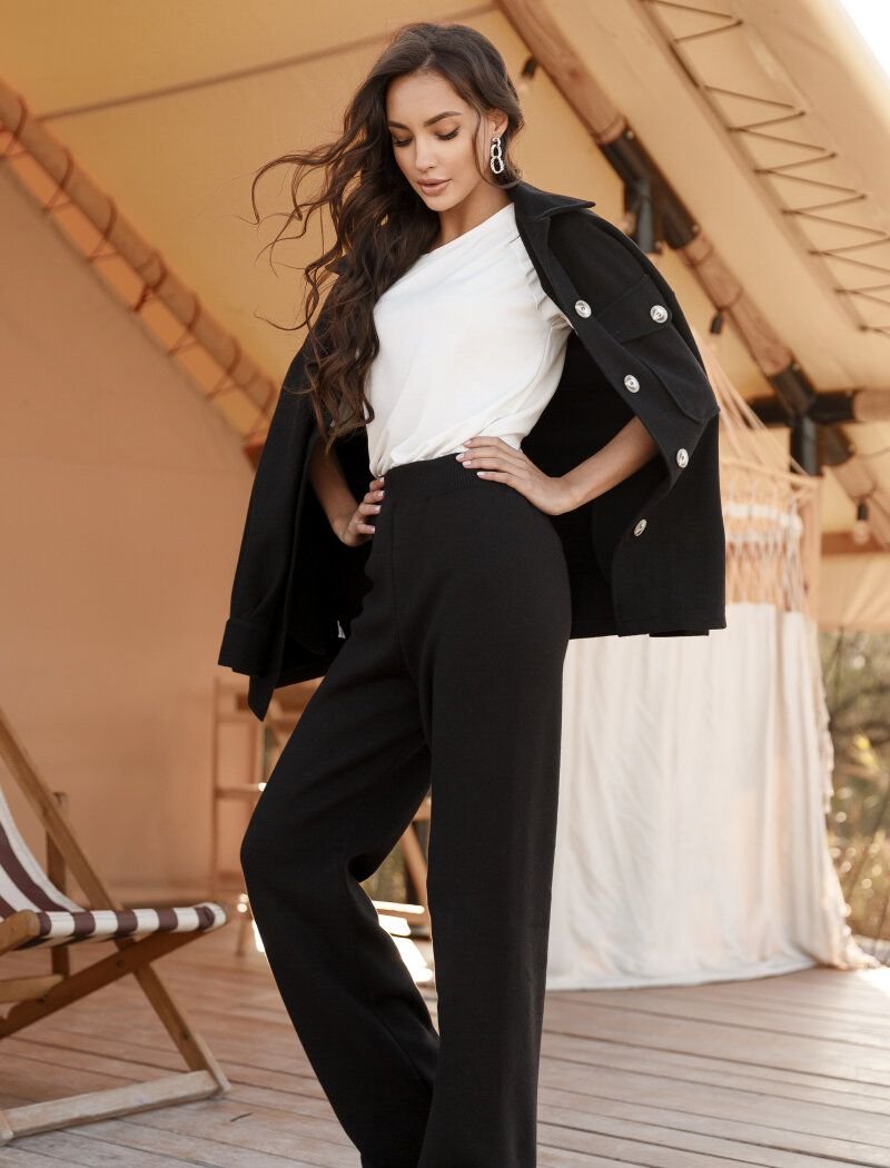 Wide trousers are made of soft knitwear, which provides comfort. The model in neutral black color is complemented by an elastic waistband.