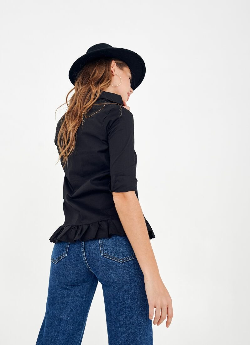 A black shirt will dilute the classic office dress code and allow you to get rid of excessive rigor in the image. A dense cotton-based material was chosen for sewing the model. The lower edge of the product was supplemented with a frill.