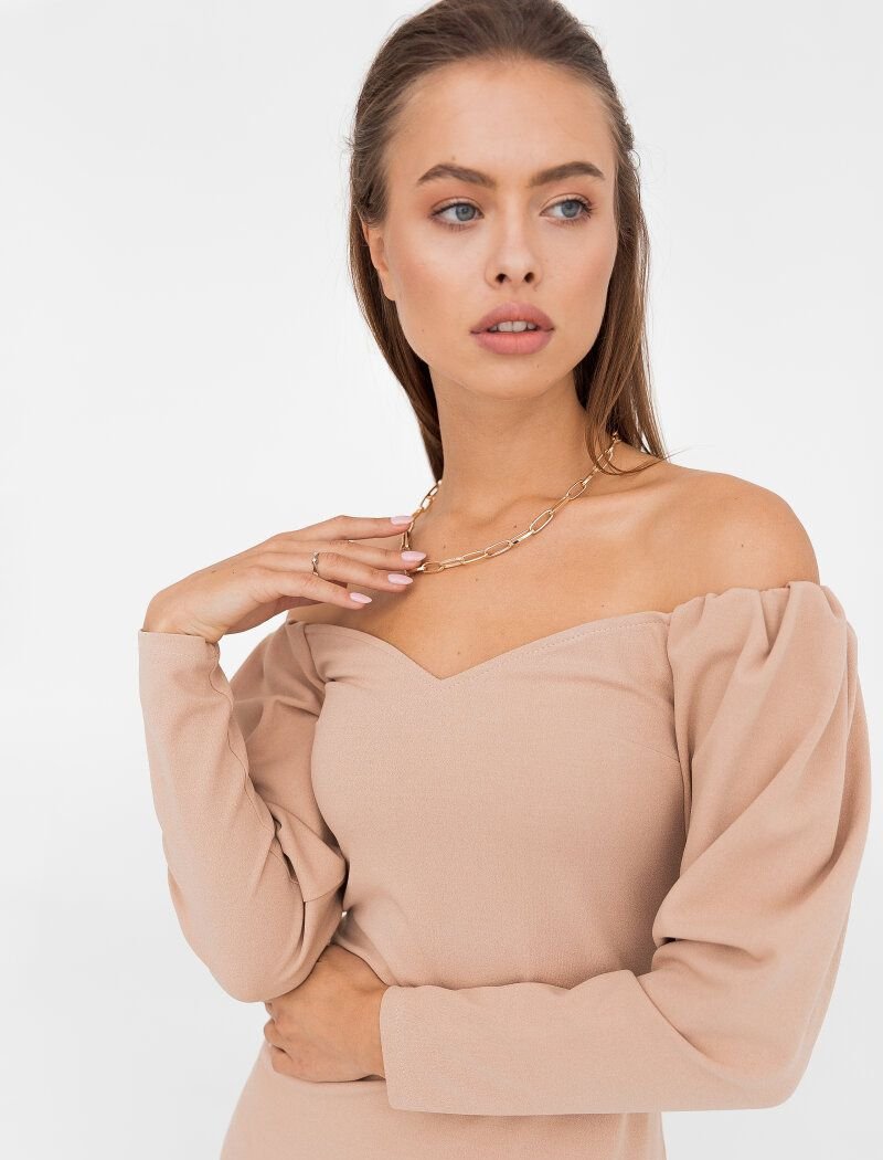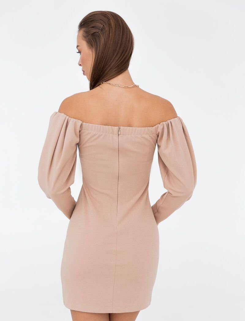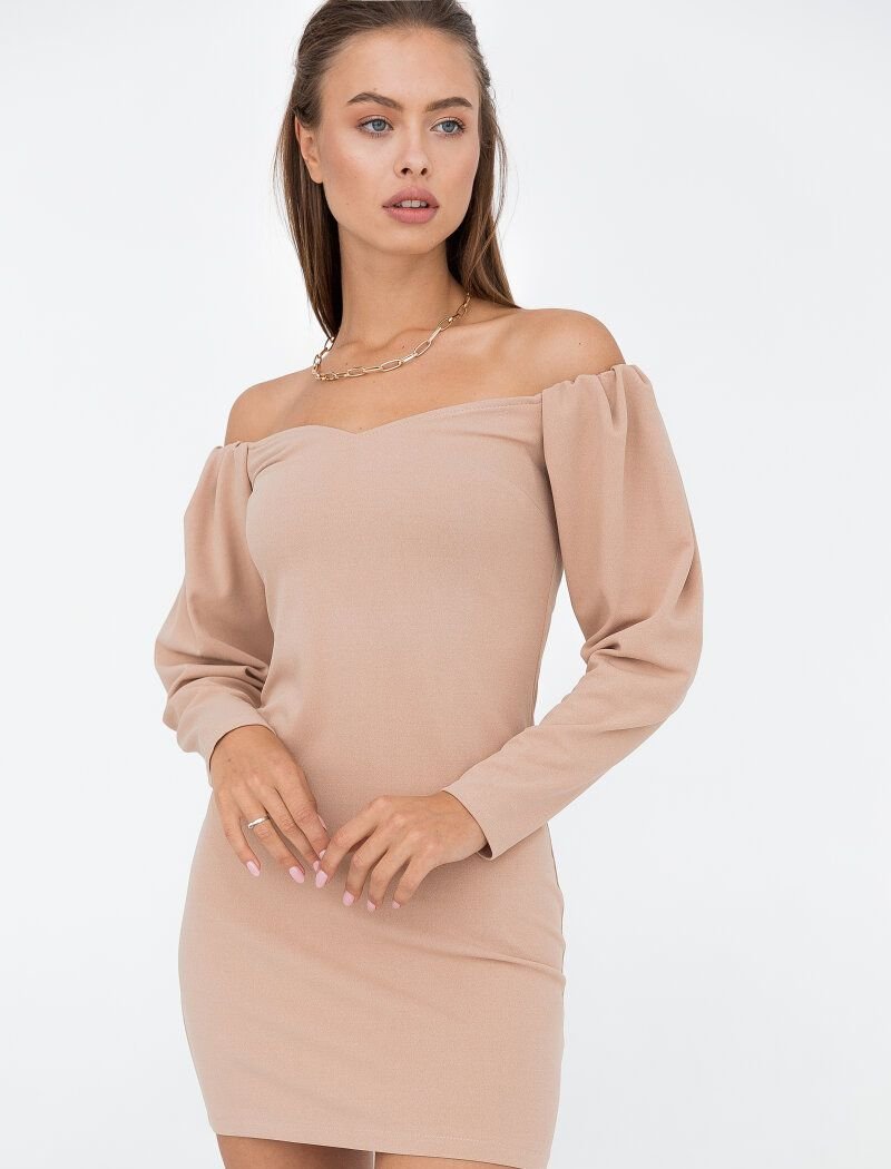 The basic beige dress has many advantages, but the key one is the seductive length. The model with open shoulders was complemented with a curly neckline.