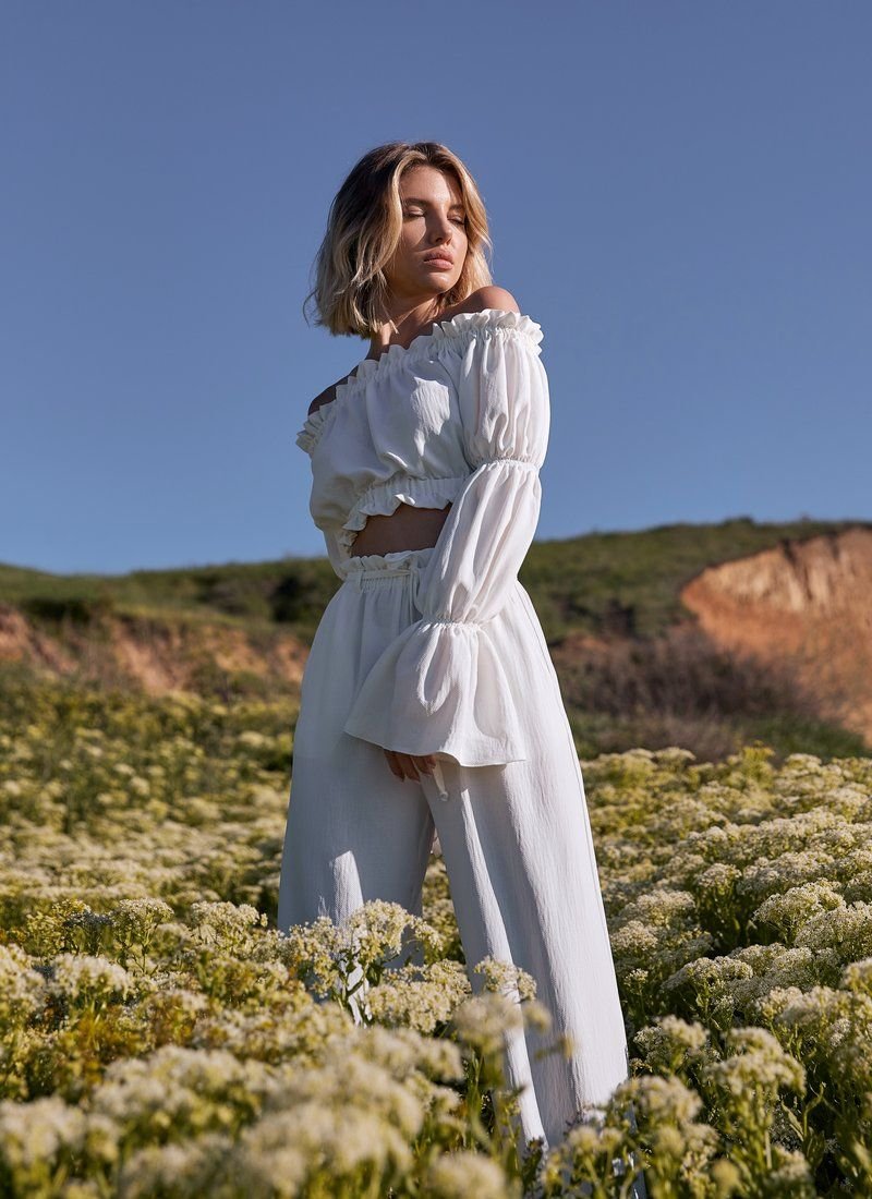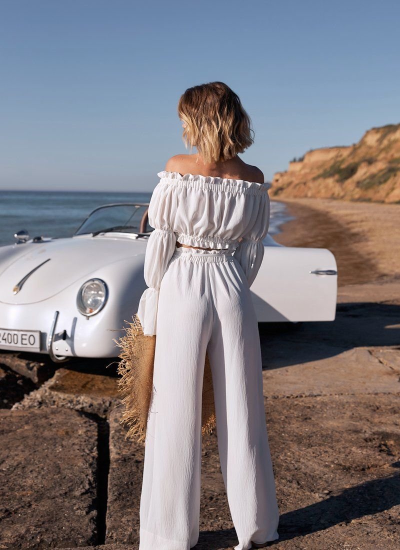Romantic summer set from Gepur designers. To create this model, a soft fabric with a compressed texture was used. The trendy top of the cropped cut is distinguished by a deep boat neckline with elastic inserts, which allows you to open the shoulders. A spectacular long sleeve with a flounce and ruffle decor are some of the most relevant details of SS21. Flowing summer trousers of a loose cut, made of soft pressed fabric. The trendy high-rise trousers are marked by an elastic insert, ruffles and a removable belt in loops. Two small pockets on the sides give the model its practicality.