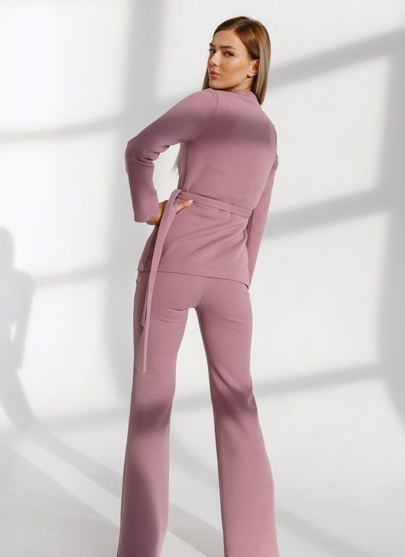 A lilac suit made of a cardigan with a smell and flared trousers fits perfectly into the FW’20/21 trend for knitted models, which have been supported by many brands. The products are made of soft elastic material that fits comfortably on the figure.