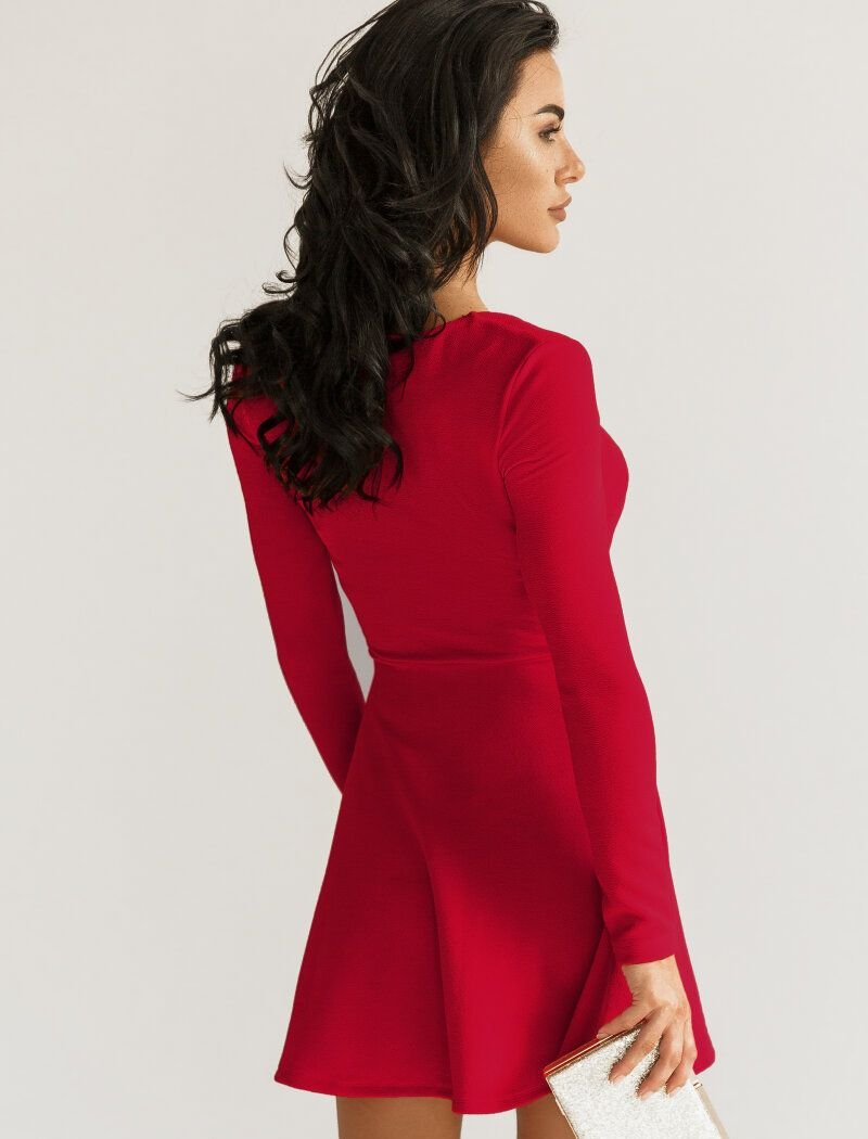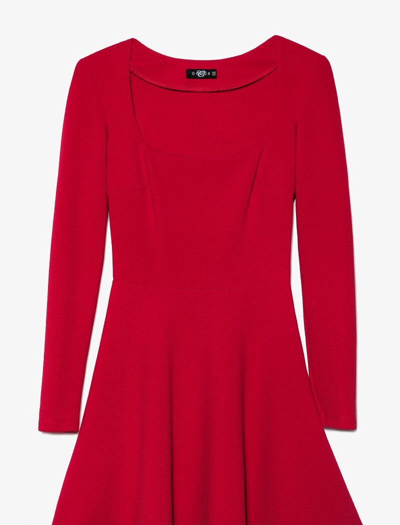 The laconic fitted model from Gepur designers is made of elastic fabric that is pleasant to the touch. Long sleeves, a deep square neckline, an inflated waistline and a flared hem make the image harmonious and complemented.